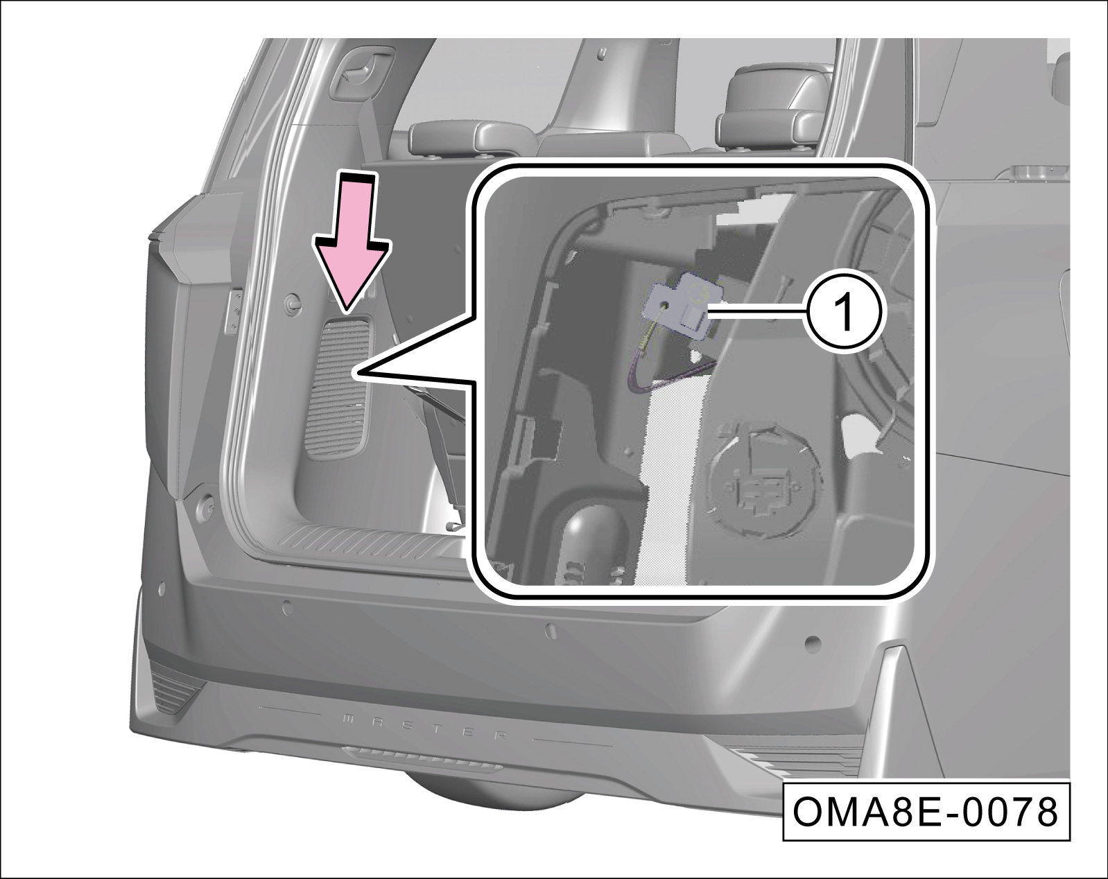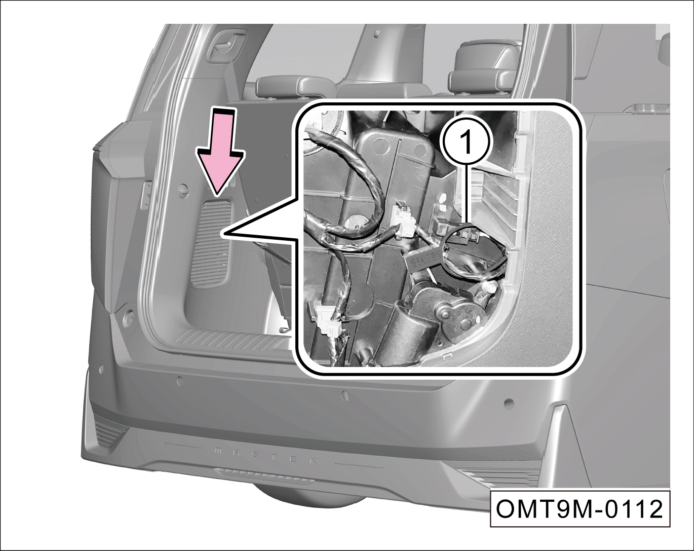 打开后背门,在-箭头-位置撬开行李箱左侧盖板,取下电子锁手动解锁拉索①。