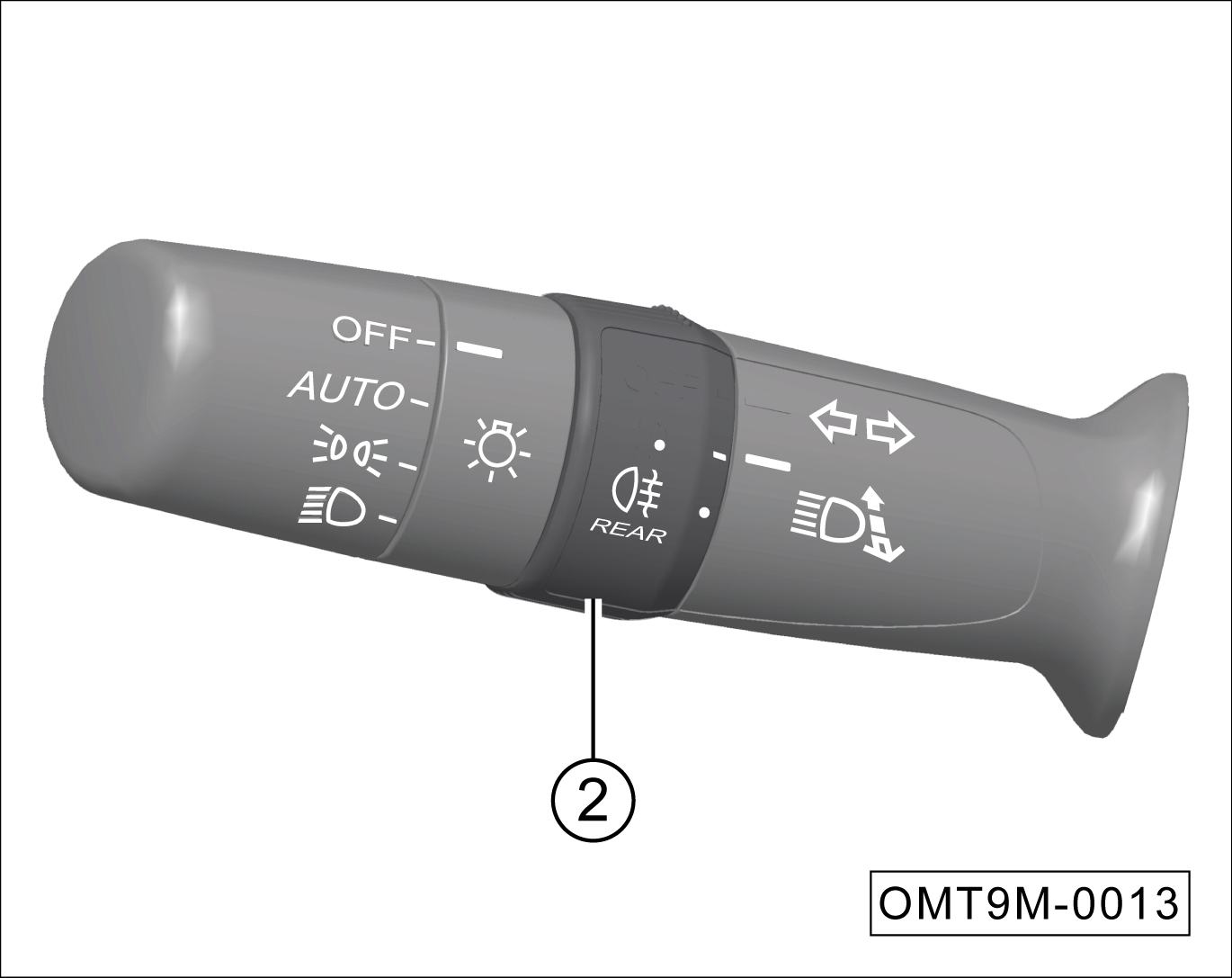 整车电源和近光灯开启时,旋转雾灯开关②控制开启或关闭