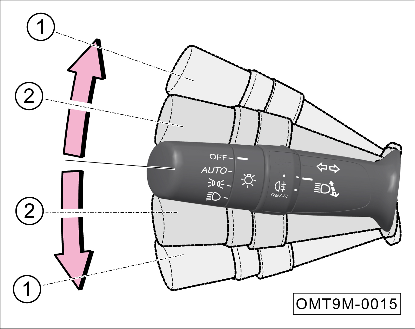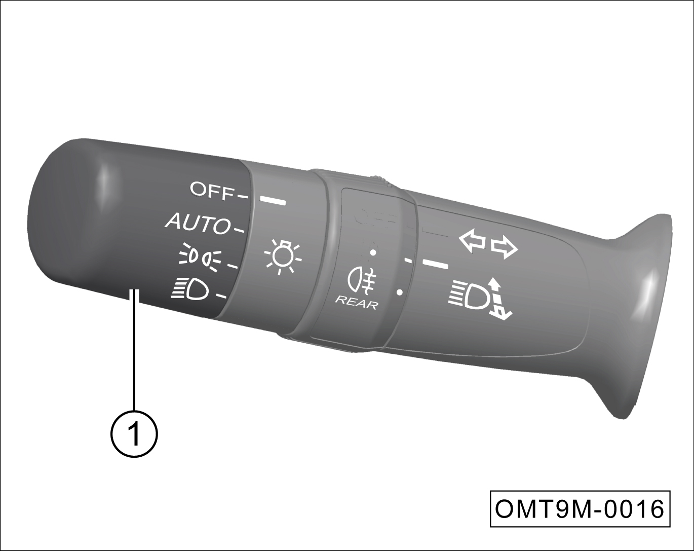整车电源开启时,旋转车灯开关①可控制开启或关闭AUTO(自动灯光)、