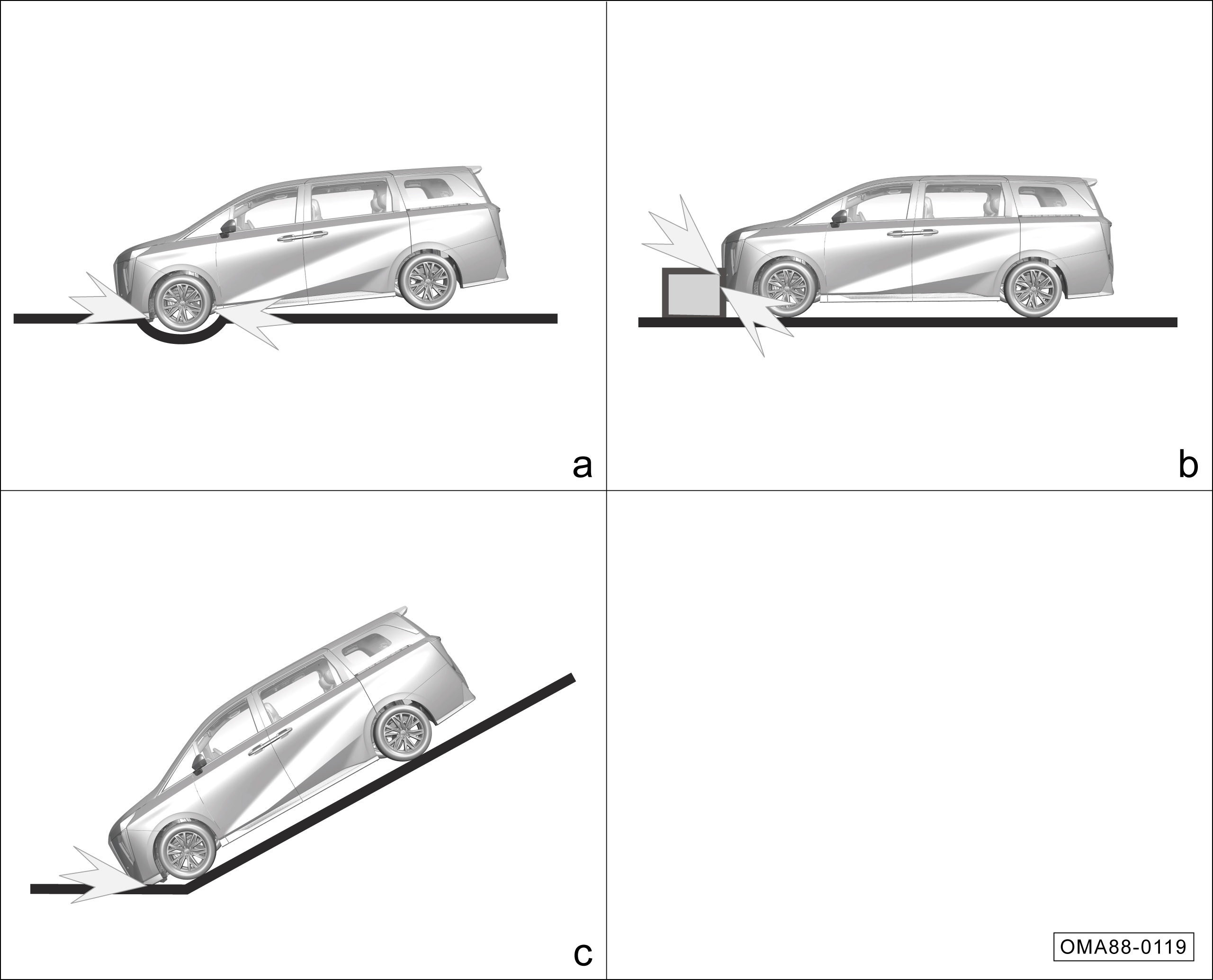 a.越过较深凹槽时,车头撞击地面。