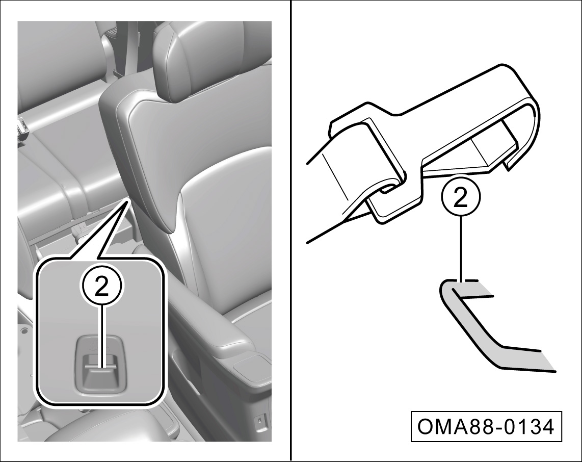 第二排座椅的下固定点①隐藏在其靠背与座垫的缝隙内;上固定点②在座椅靠背的后部。