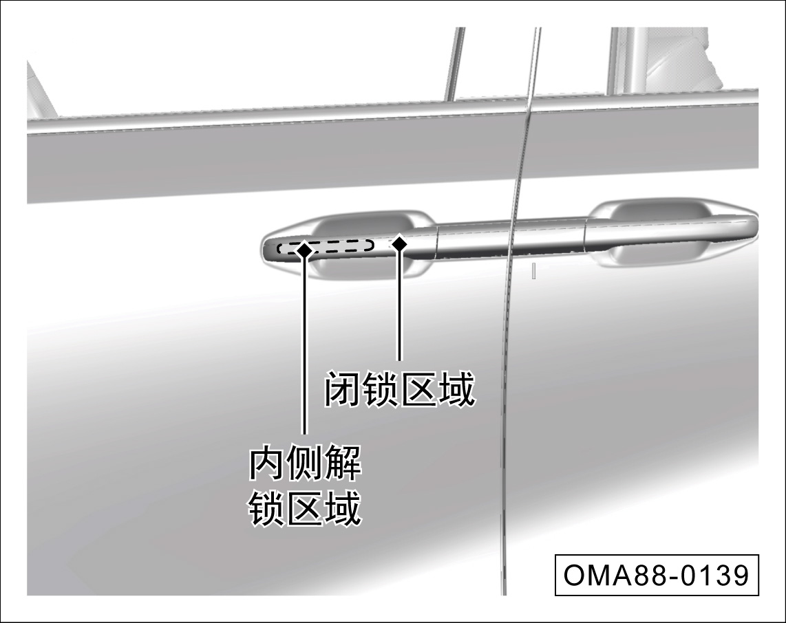 当整车电源在“OFF”挡位时,携带智能遥控钥匙离开车内,将所有车门关闭后,触摸闭锁区域,有效感应后所有车门闭锁。