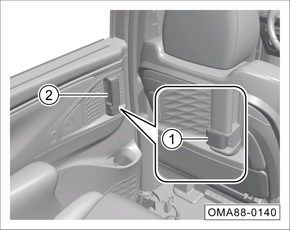 将车门锁栓①向后推时,可解锁对应的车门;再向后拉车内拉手②,可打开对应的滑移门。
