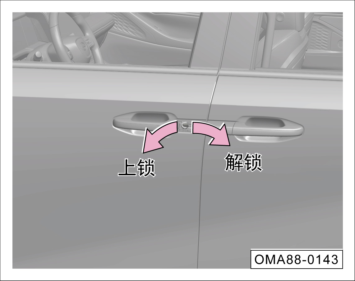 若车辆处于上锁状态,拉动驾驶员侧车门内拉手一次,四门解锁。拉动其他侧车门内拉手一次,仅解锁对应侧车门,再次拉动将解锁四门。