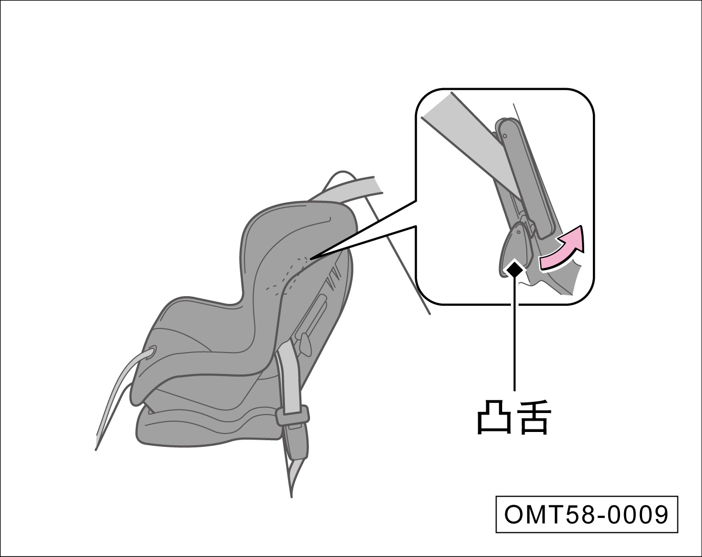 向下推凸舌,将肩部安全带穿过儿童安全座椅边上的狭缝。