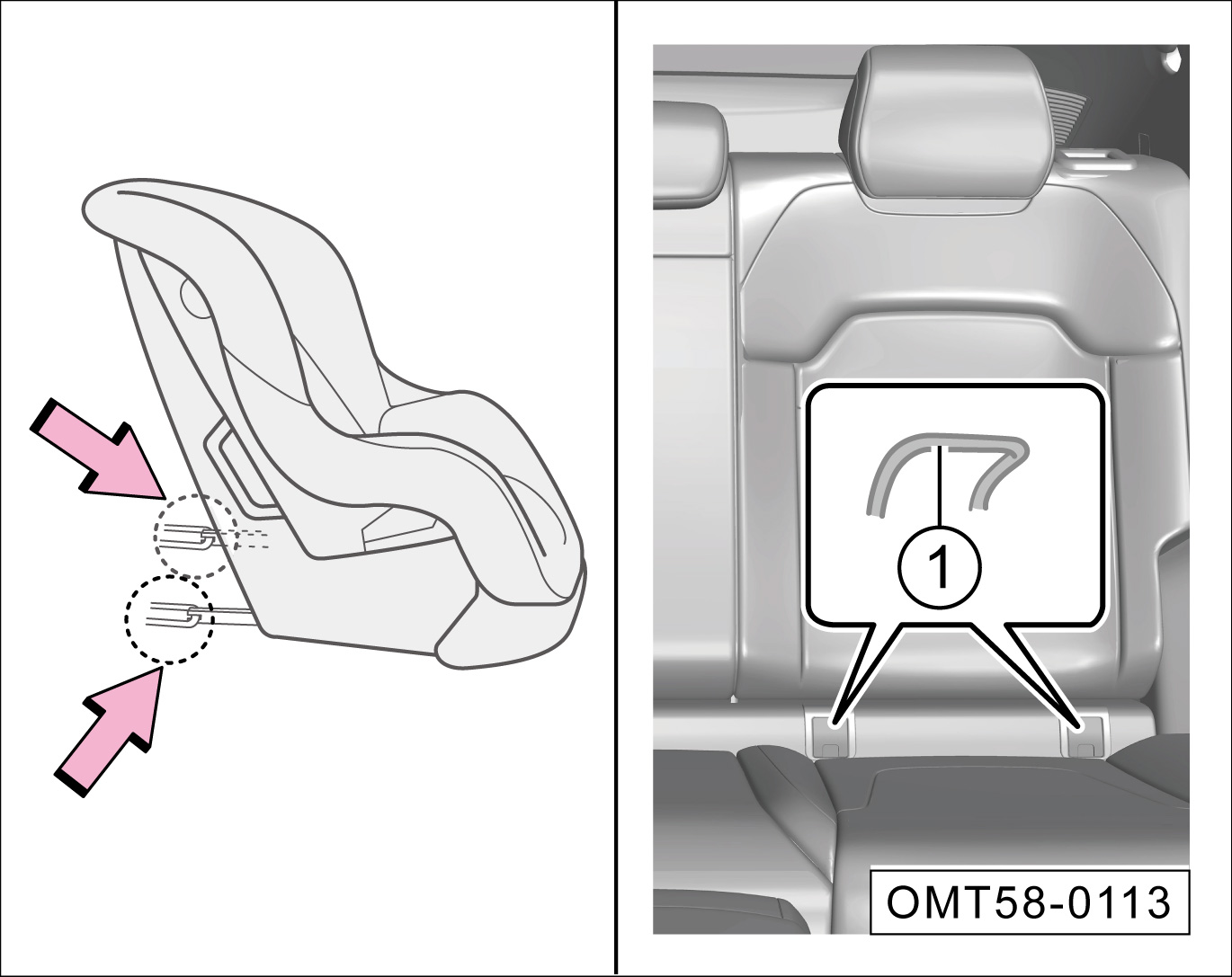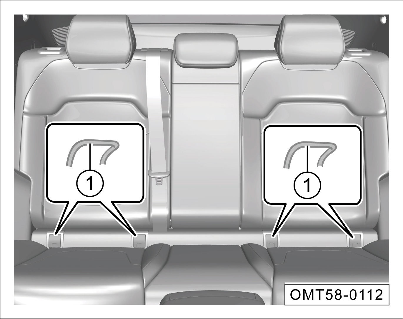 第二排座椅的后固定点②位于其靠背后方或第二排座椅上方顶棚位置,图示以座椅靠背后方为例,翻开固定点②的保护盖即可看到。