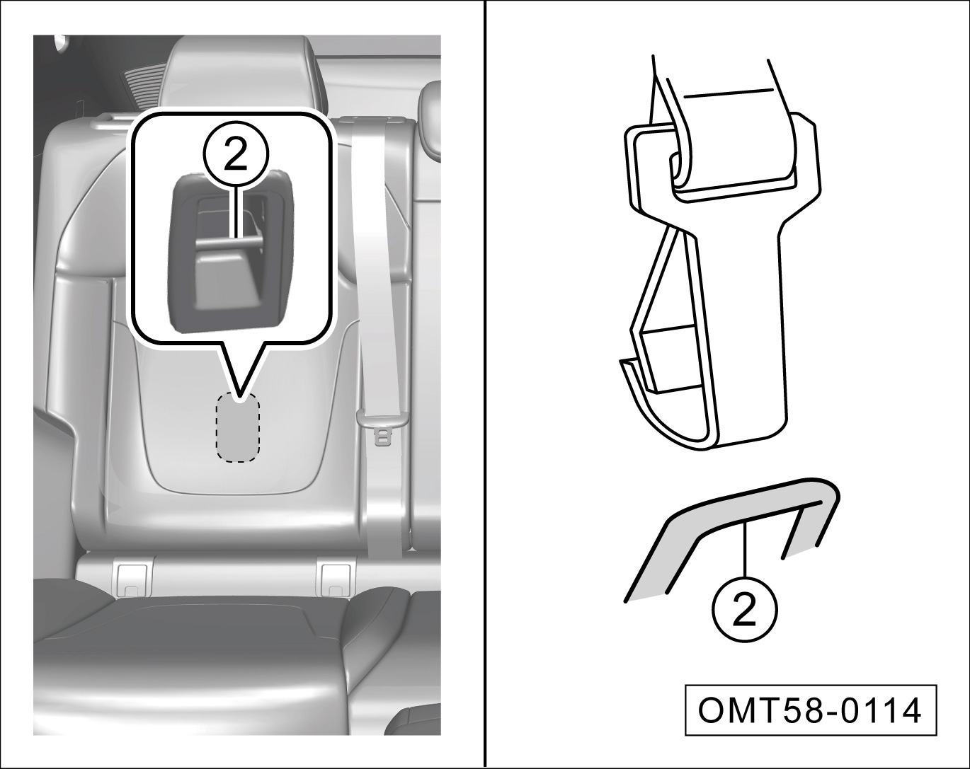 将紧固带穿过靠背顶部,翻开后固定点②的保护盖,并将紧固带钩勾住后固定点②,确保紧固带未扭曲。