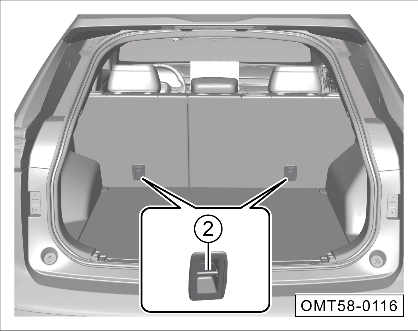 掀开盖子,第二排座椅的前固定点①在盖子下面。