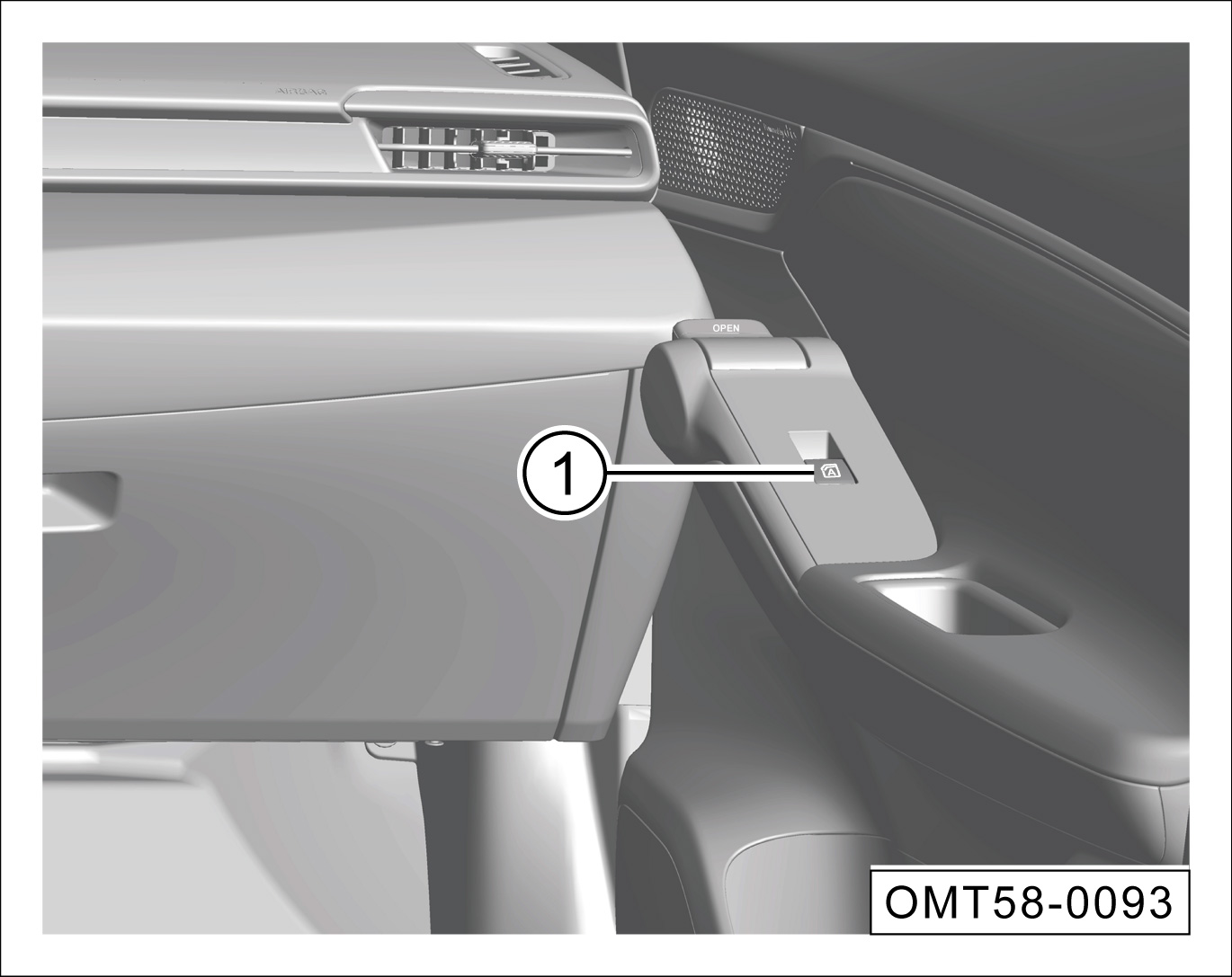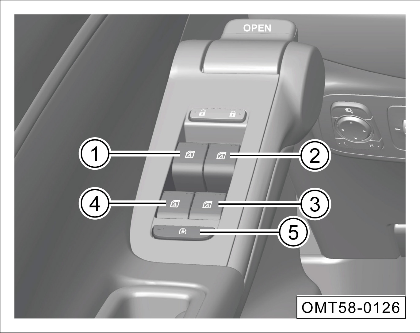 按下按键①到第一个停止位置,电动车窗将向下打开,直到松开按键或者车窗下降至最低位置。