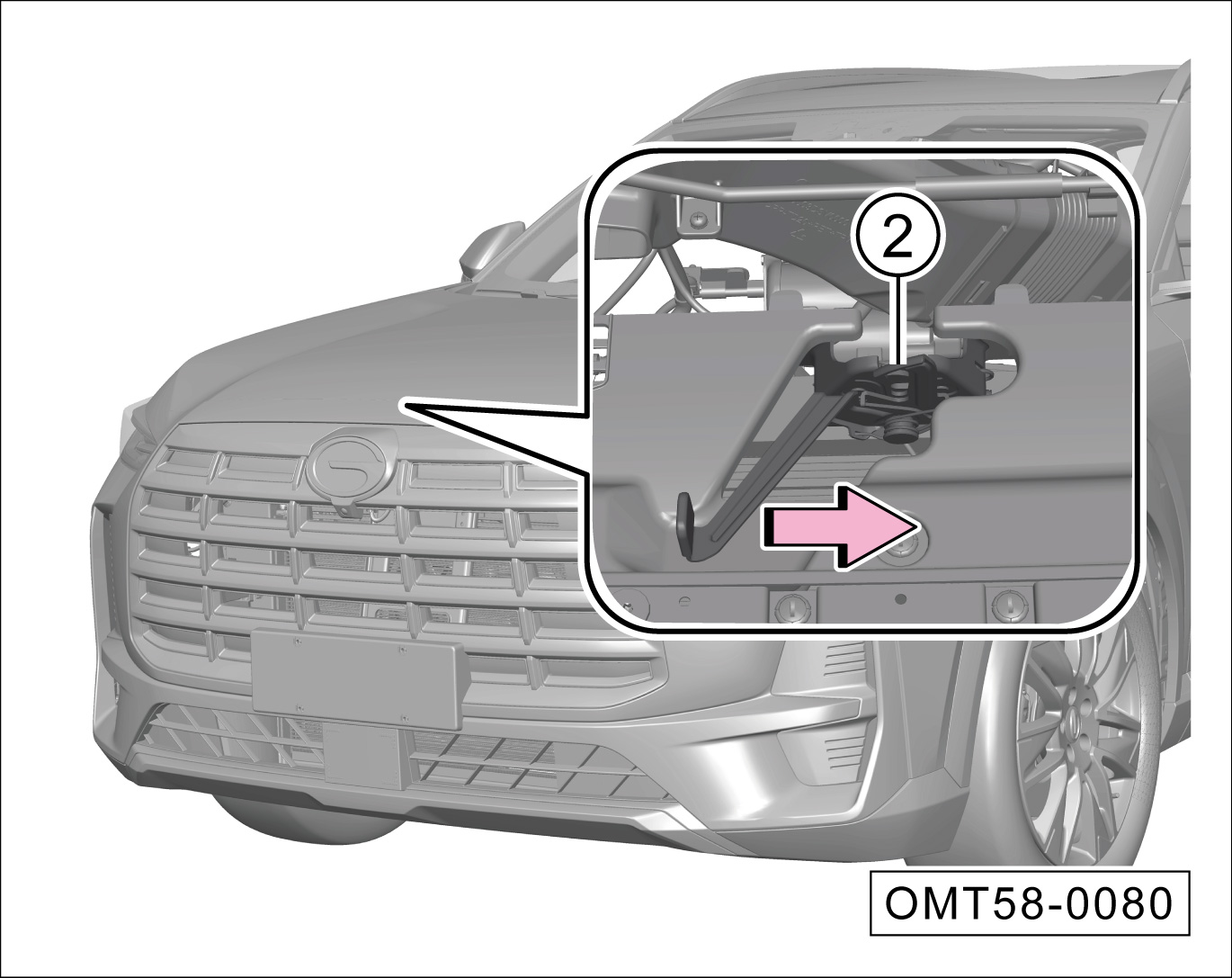 拉动前机舱盖开启拉手①,前机舱盖将解锁并轻微弹起。