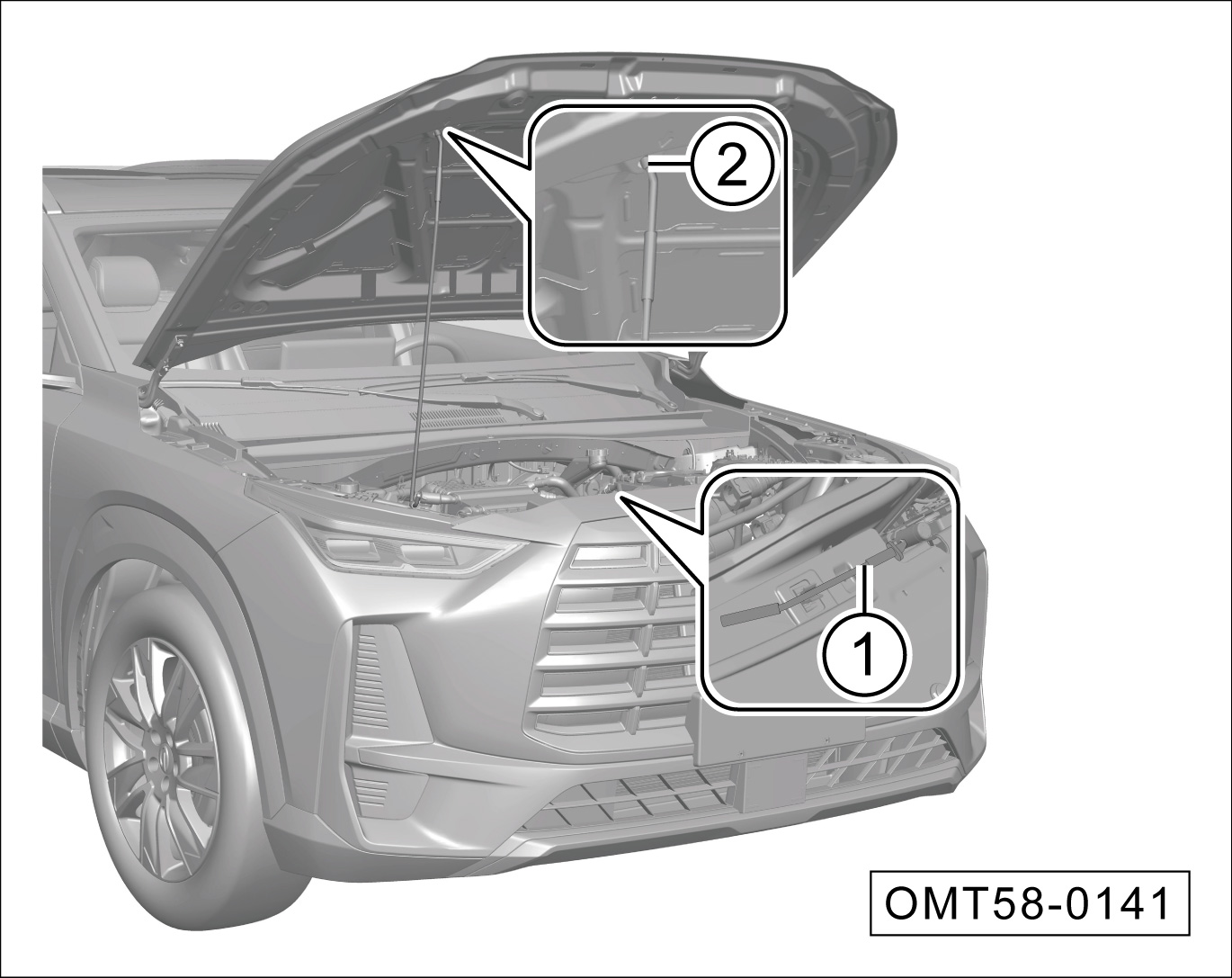 将前机舱盖上抬至限位位置,从支撑杆支架①取出支撑杆,并将支撑杆固定在固定孔②,可支撑前机舱盖在限位位置。