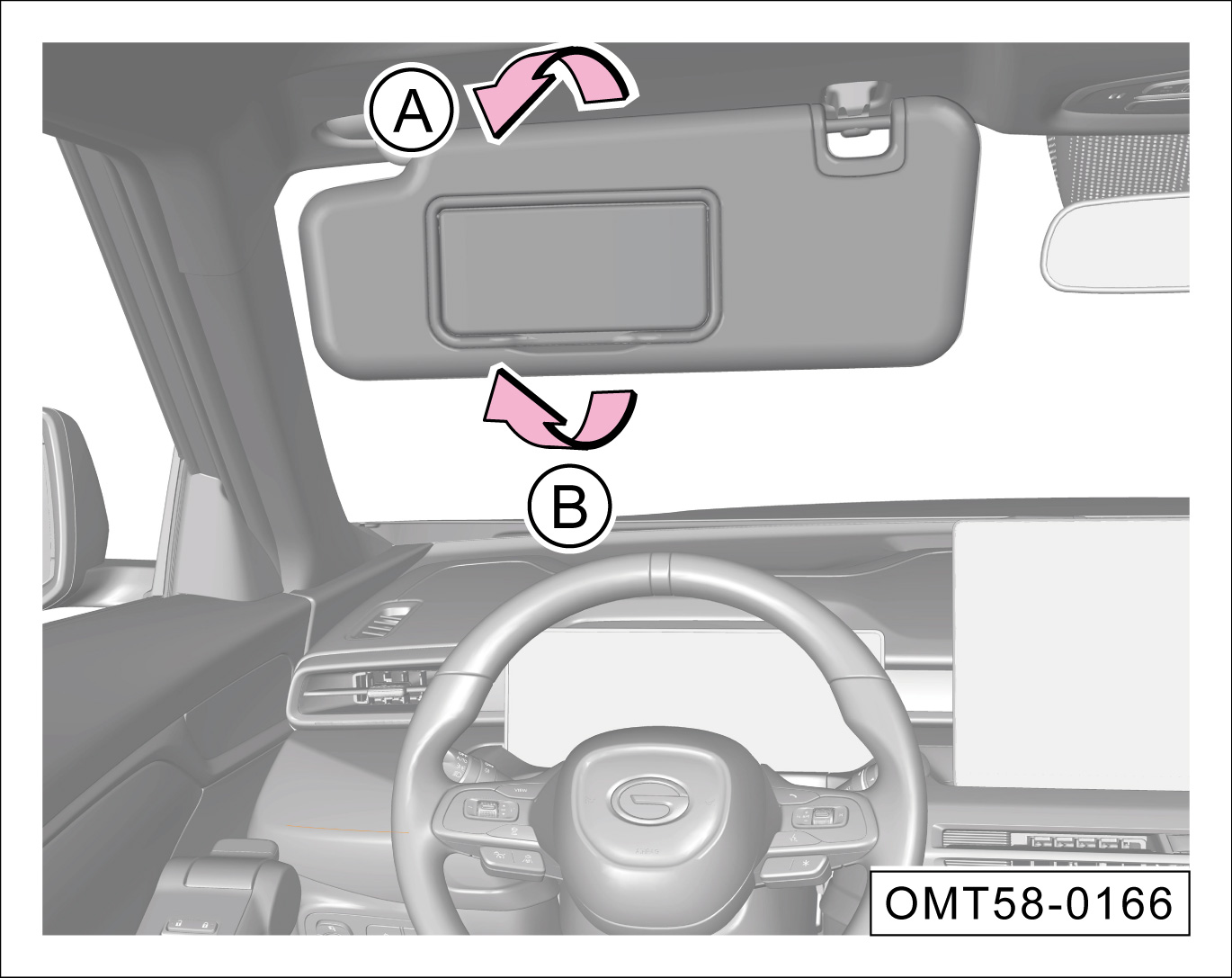沿-箭头A-方向下翻驾驶员侧或前排乘员侧的遮阳板,可遮挡从前风窗射入的阳光。