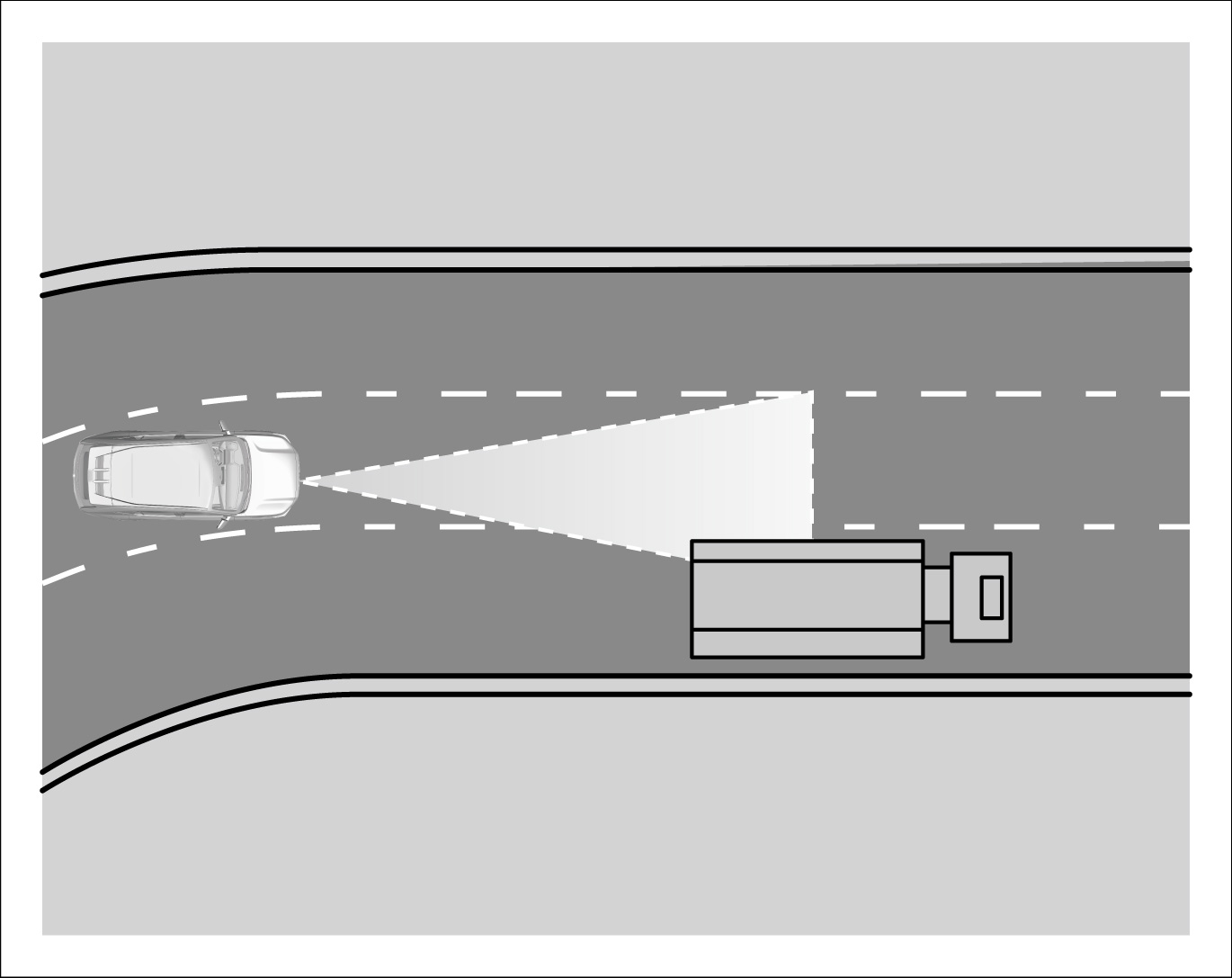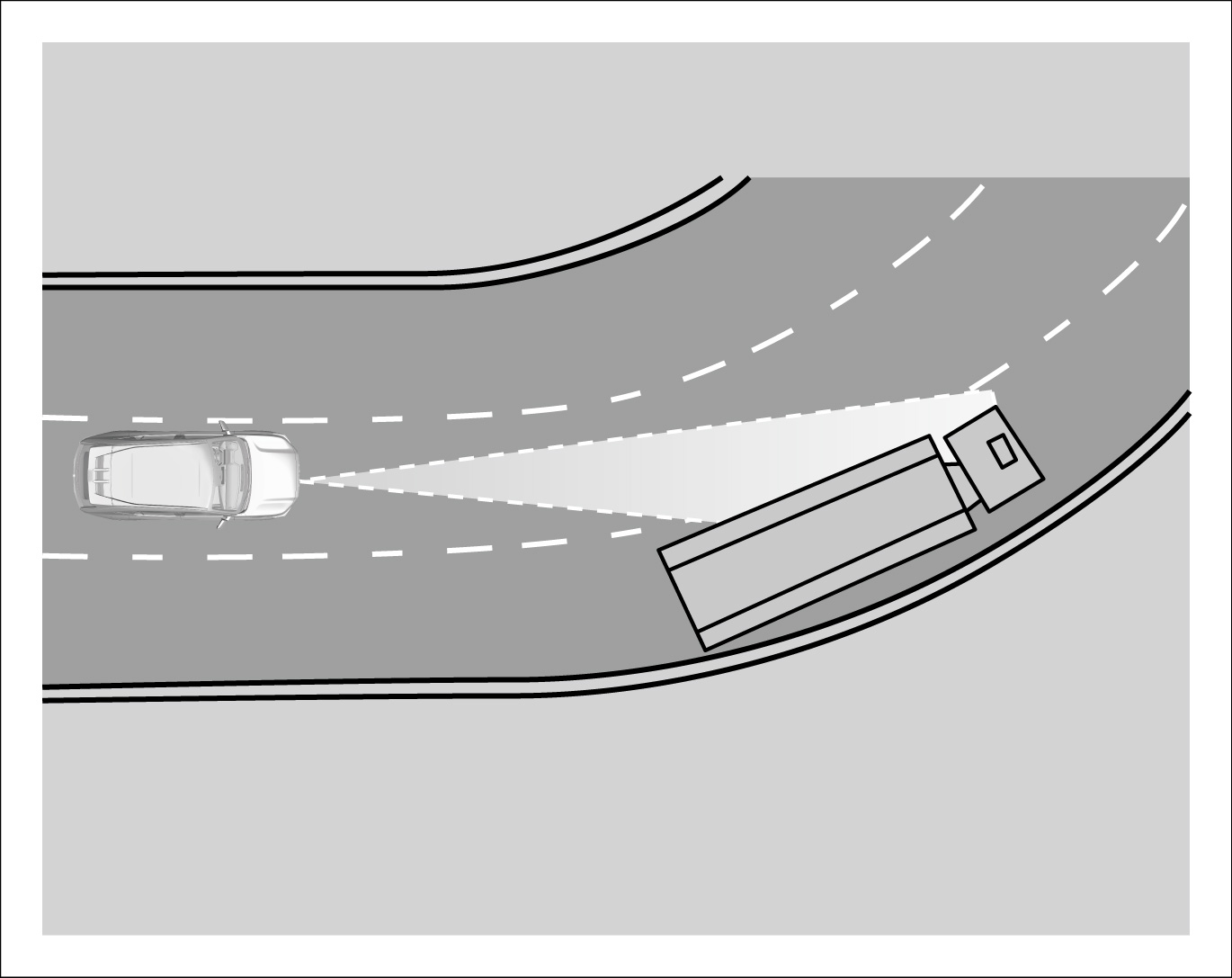 驶出弯道。驶出长弯道时,因为系统将预先计算行车道,所以雷达传感器可能会对相邻车道上的车辆作出反应而对本车制动。此制动过程可通过踩下油门踏板来中断。