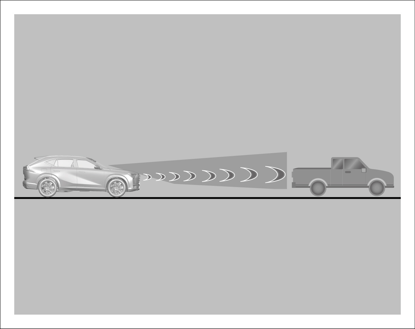 ACC根据安装在车辆前部的毫米波雷达和前风窗玻璃上的智能前向摄像头,探测同一路径的前车和本车之间的相对距离和速度:
