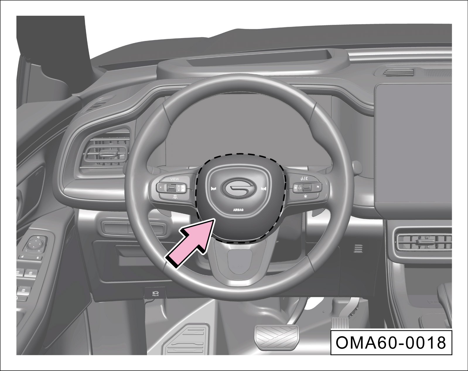 驾驶员正面安全气囊安装在方向盘内部(虚线阴影部分),“AIRBAG”为安全气囊标志。