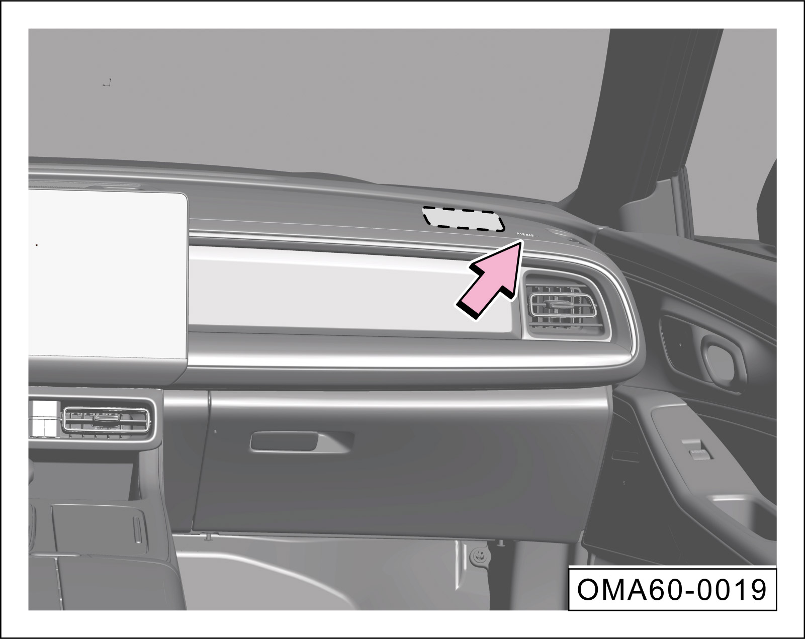 前排乘员正面安全气囊安装在仪表台内部(虚线阴影部分),“AIRBAG”为安全气囊标志。