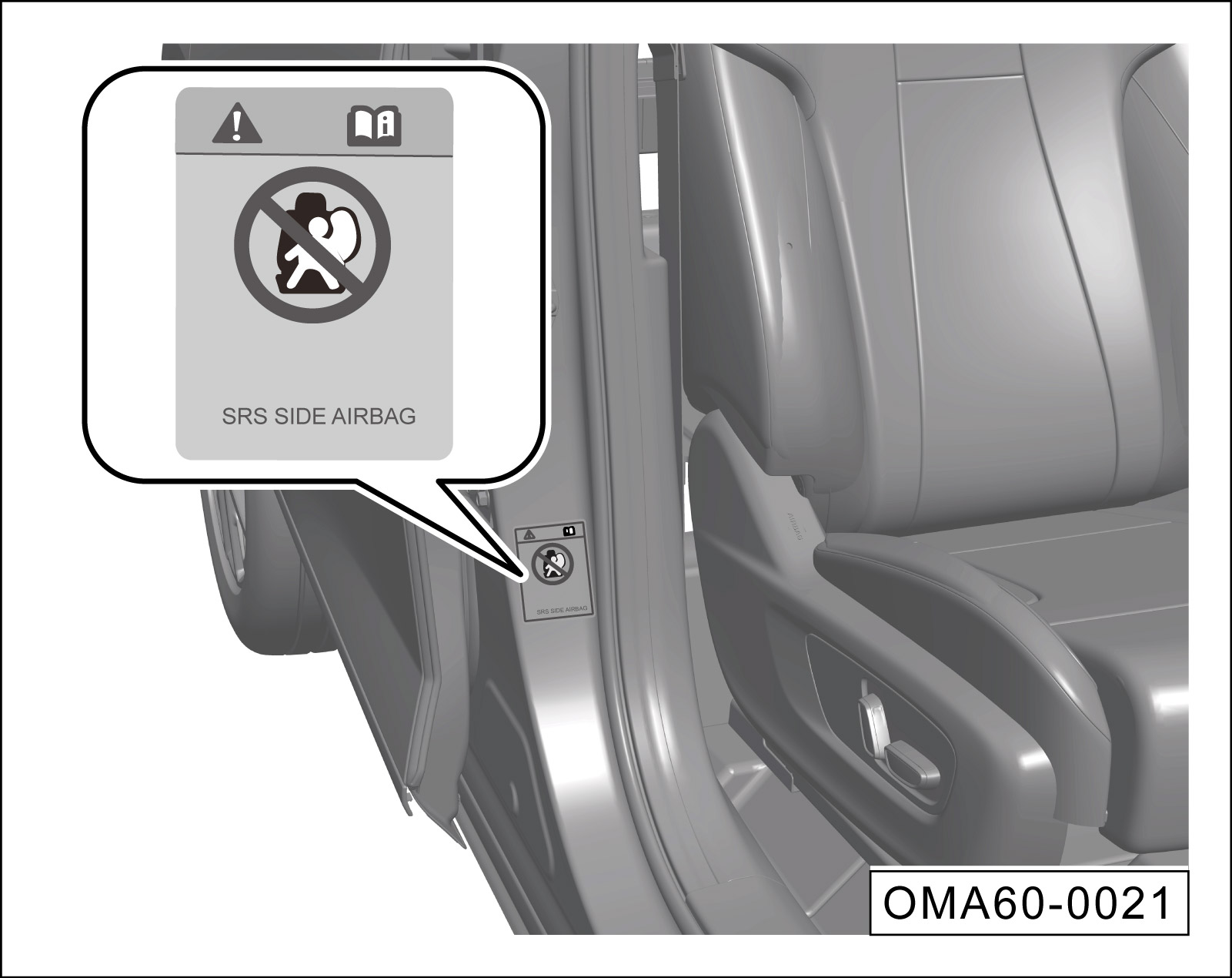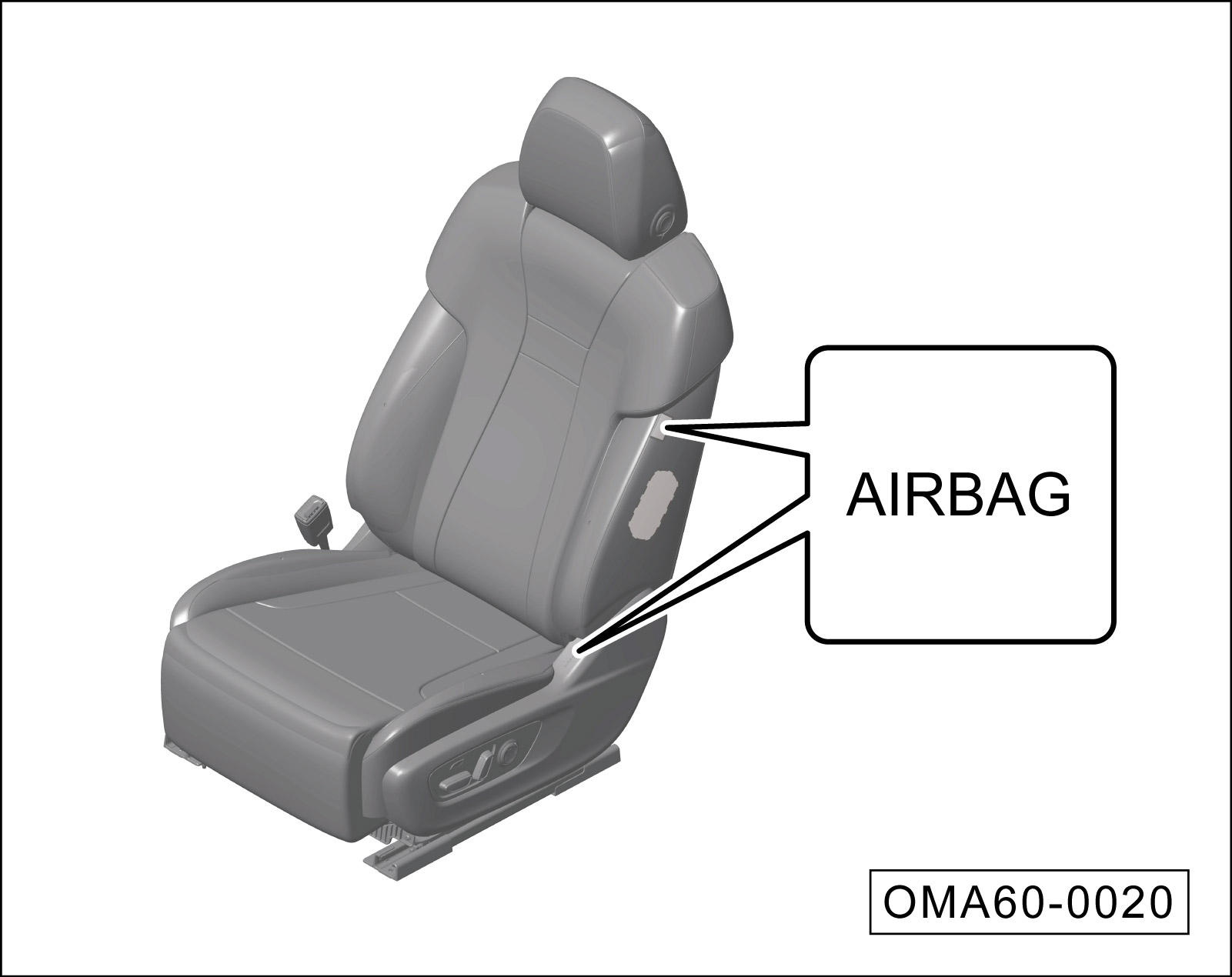 前排侧面安全气囊安装在驾驶员座椅及前排乘员座椅靠背向门侧内部(虚线阴影部分),“AIRBAG”为安全气囊标志。