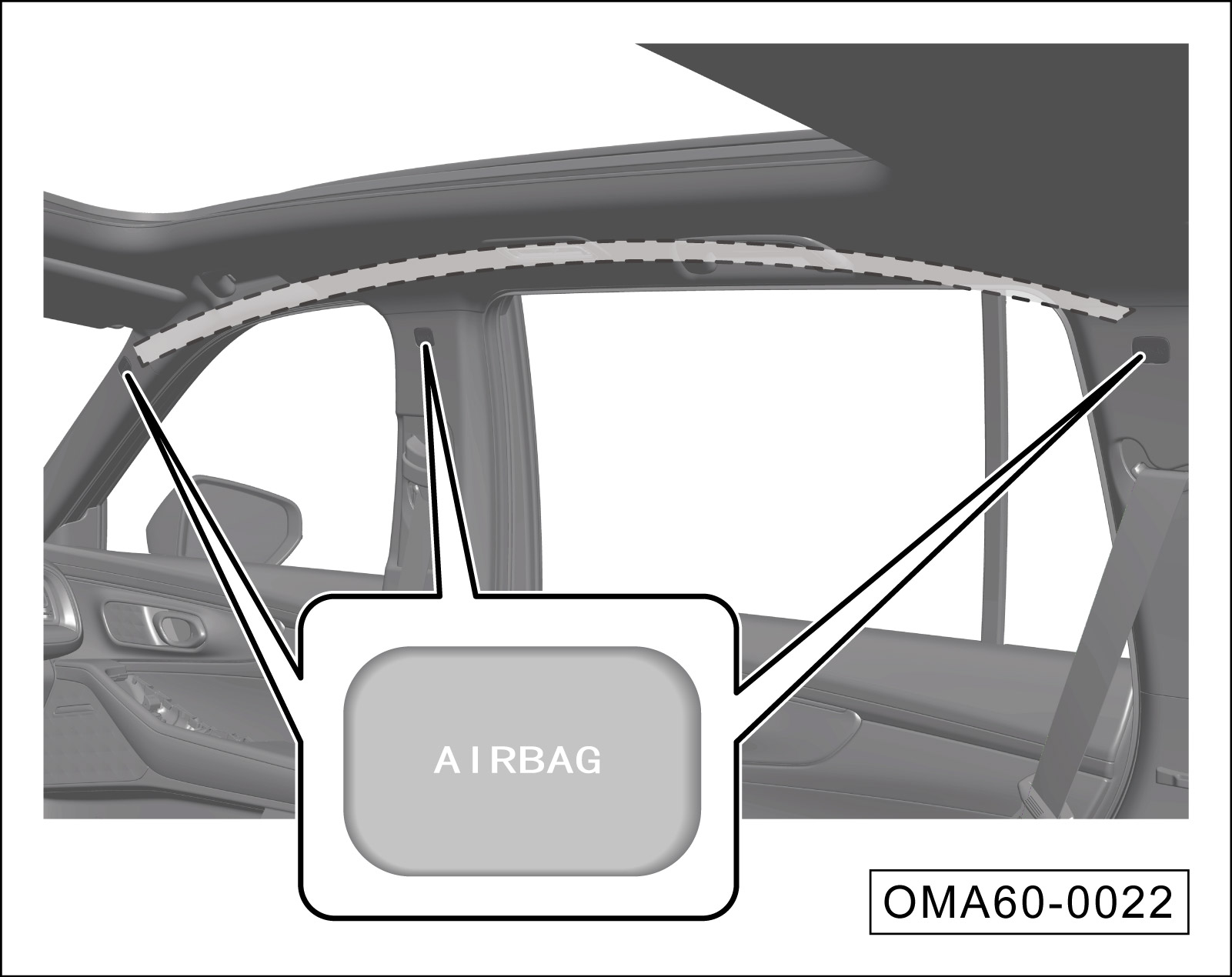 侧窗帘式安全气囊安装在顶棚左、右两侧内部(虚线阴影部分),“AIRBAG”为安全气囊标志。
