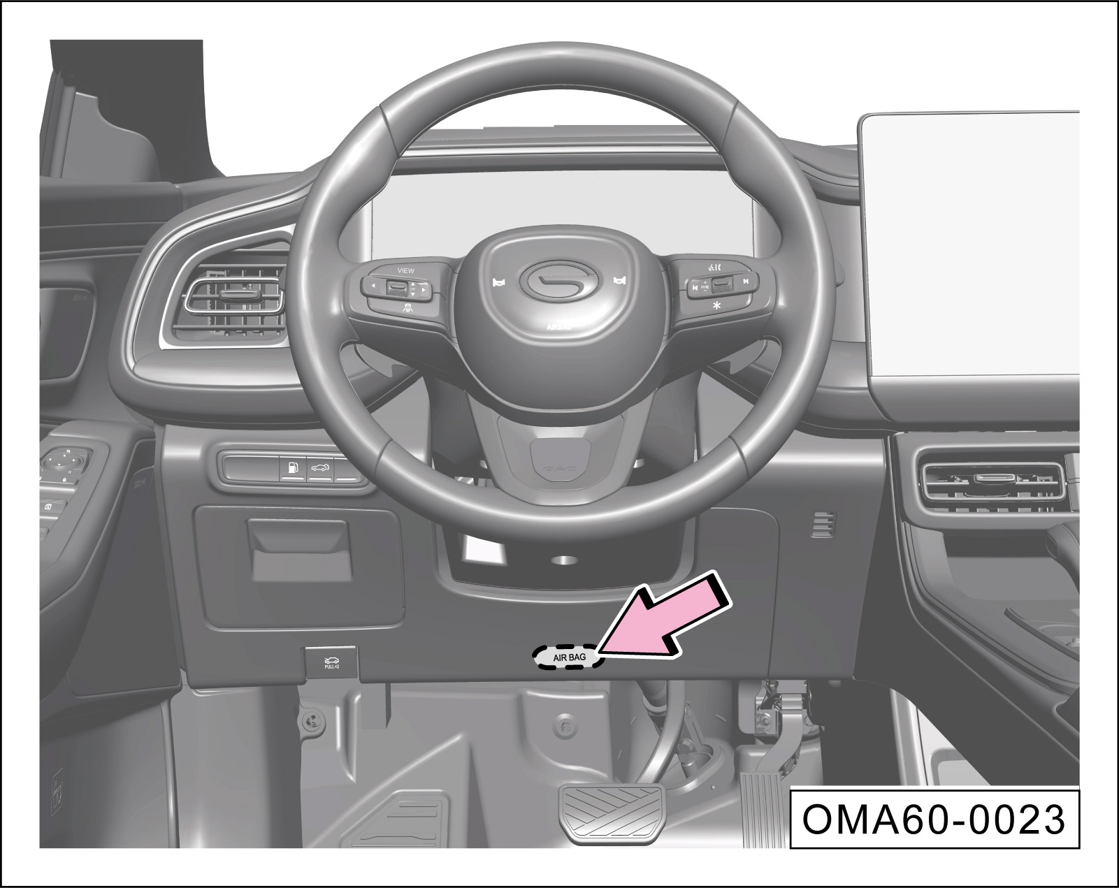驾驶员膝部安全气囊安装在驾驶室仪表台正下方(虚线阴影部分),“AIRBAG”为安全气囊标志。