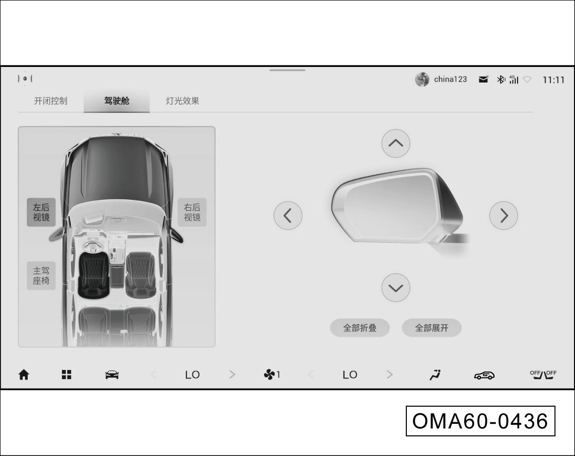 在音响系统显示屏上,通过“我的车→驾驶舱→左后视镜/右后视镜”界面,点击“全部折叠”、“全部展开”软按键控制外后视镜折叠或展开。