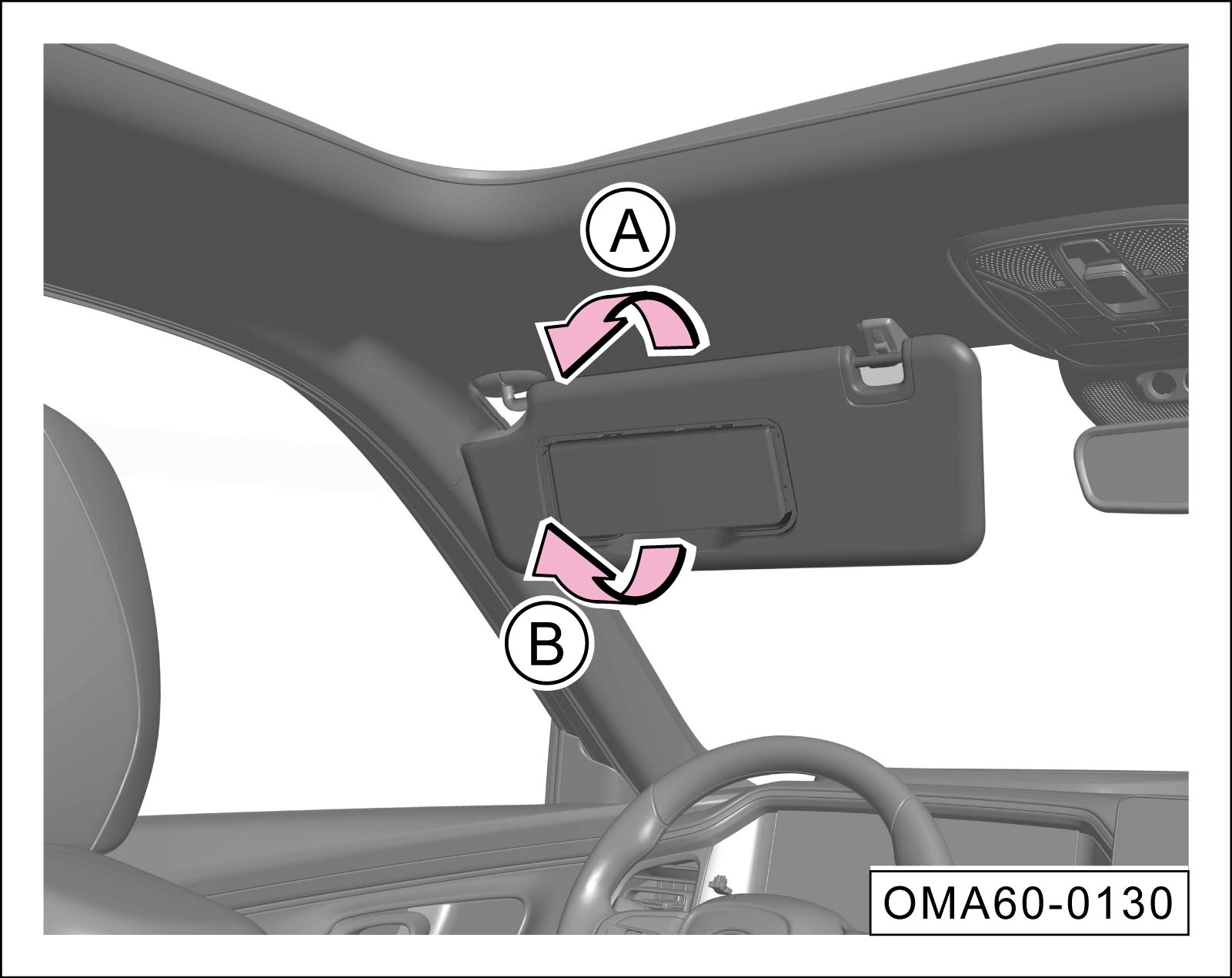 沿-箭头A-方向下翻驾驶员侧或前排乘员侧的遮阳板,可遮挡从前风窗射入的阳光。
