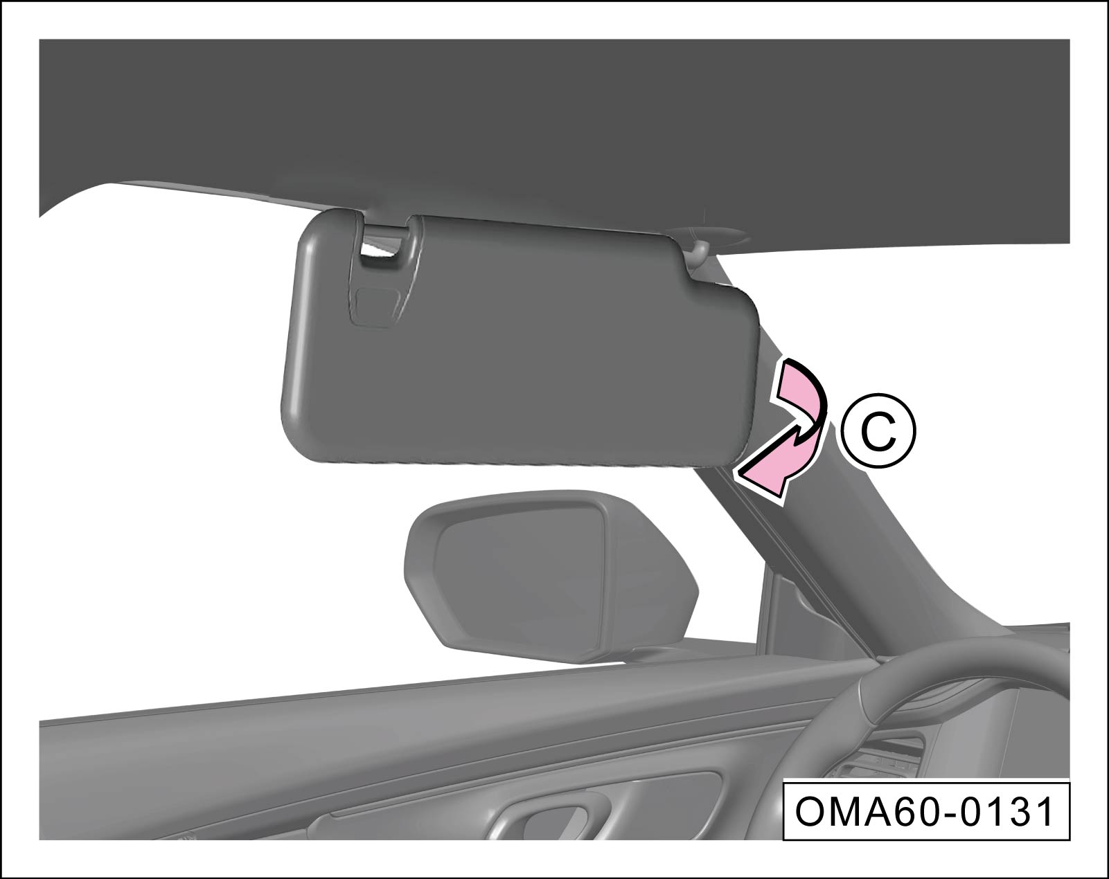 下翻驾驶员侧或前排乘员侧的遮阳板后,沿-箭头C-方向从一侧活动支架拉出,可遮挡从侧车窗射入的阳光。