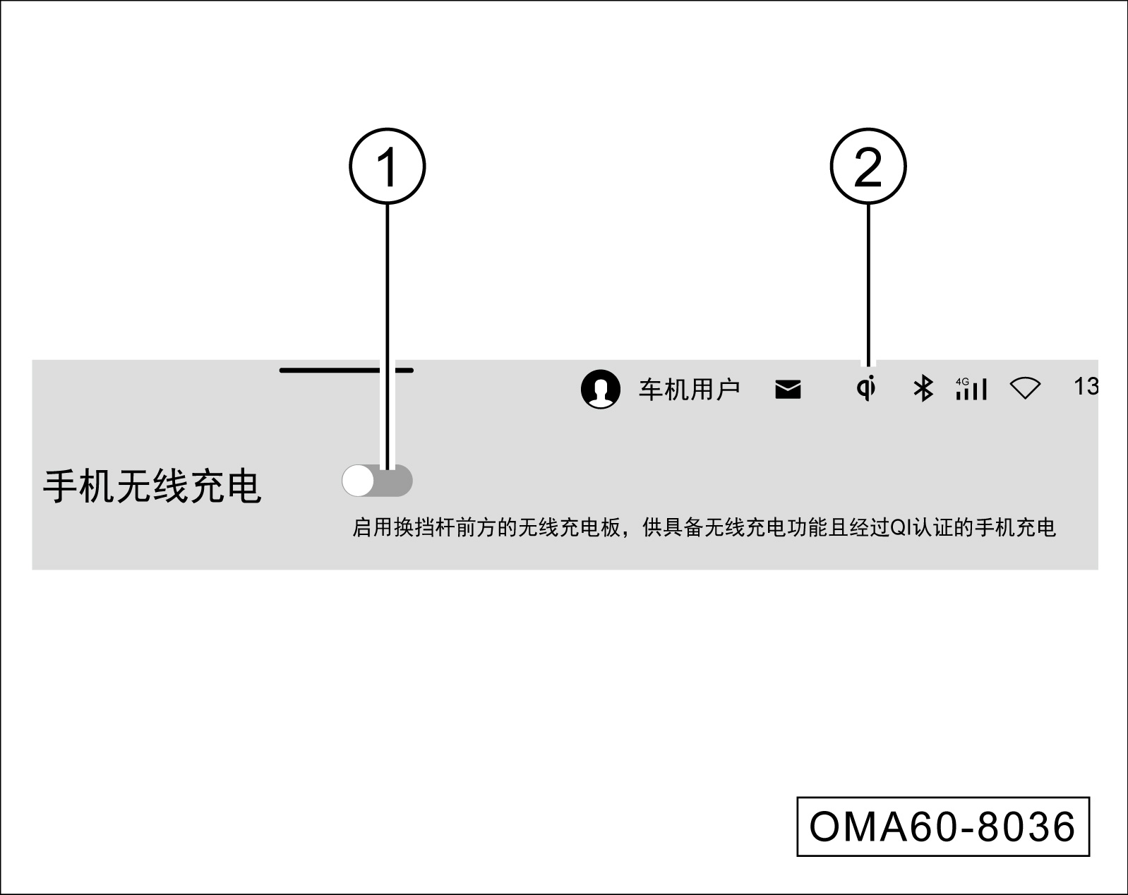 手机无线充电系统开启后,界面状态栏会显示②所指的图标,图标状态会根据手机无线充电系统使用而改变,点击图标后有相应的文字信息弹出。