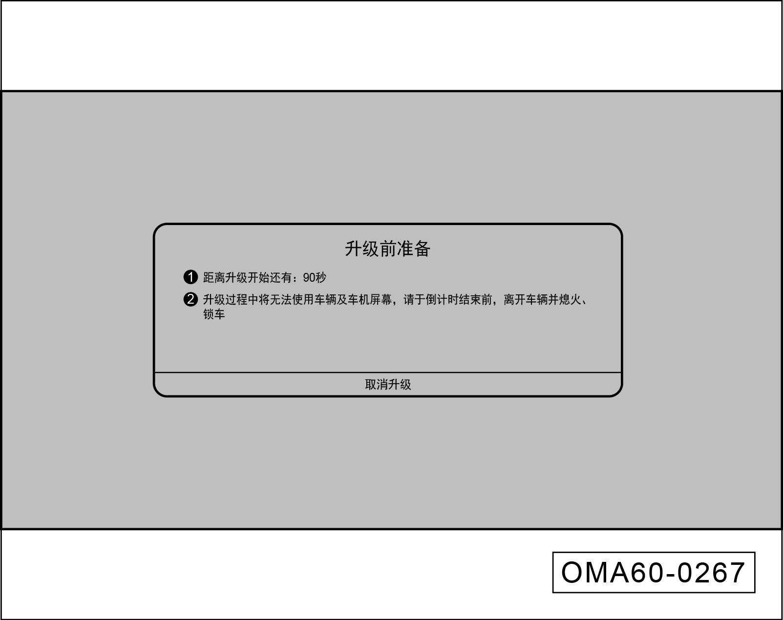 正式升级时,进入90s倒计时页面,同时提示用户关闭整车电源、离开并给车辆上锁。倒计时结束前可通过“取消升级”按钮取消升级;倒计时结束时开始升级。