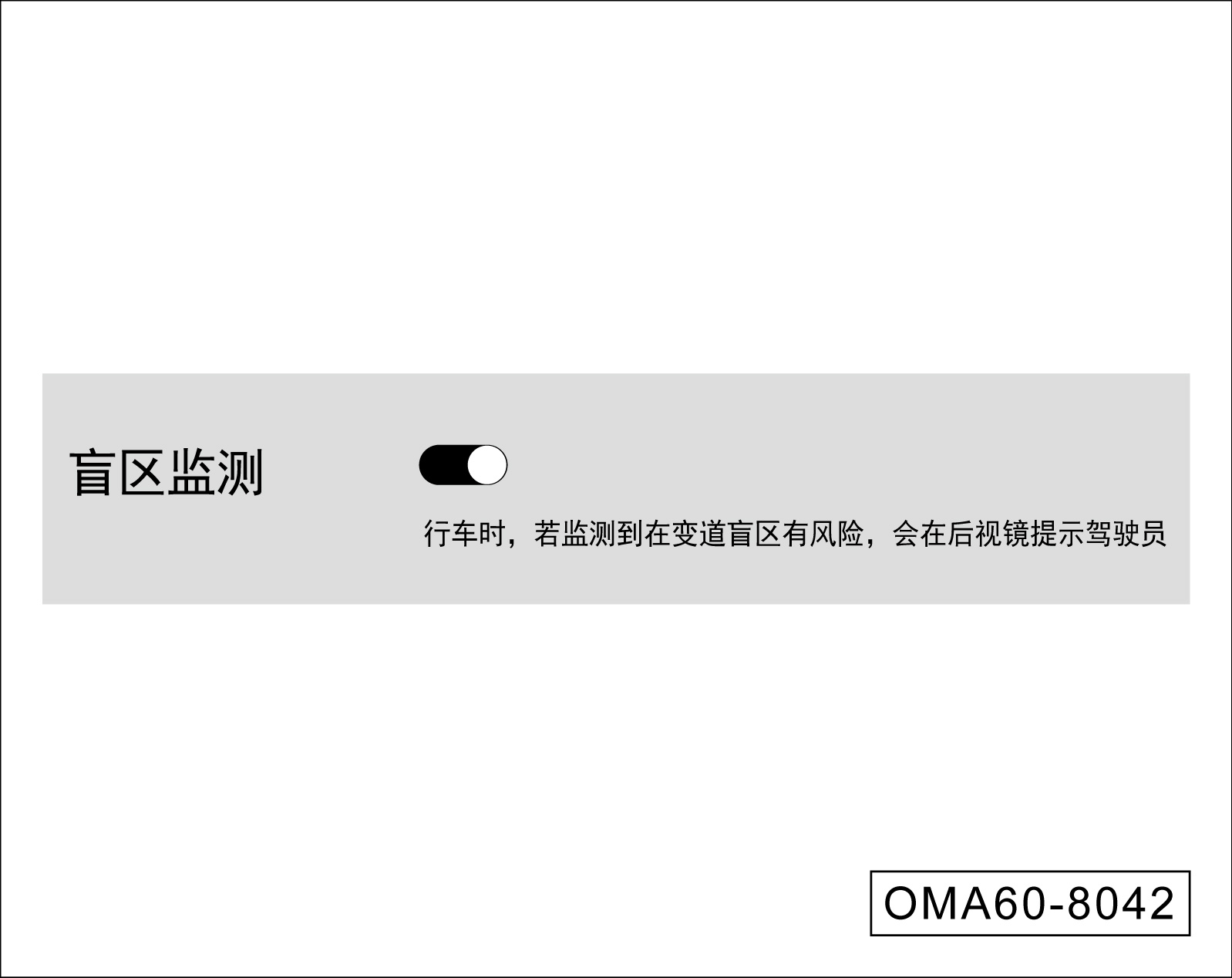 整车电源在“ON”挡位或发动机启动后,进入音响系统“设置→ADiGO智能驾驶→ADiGO主动安全”界面,点击“盲区监测”右侧
