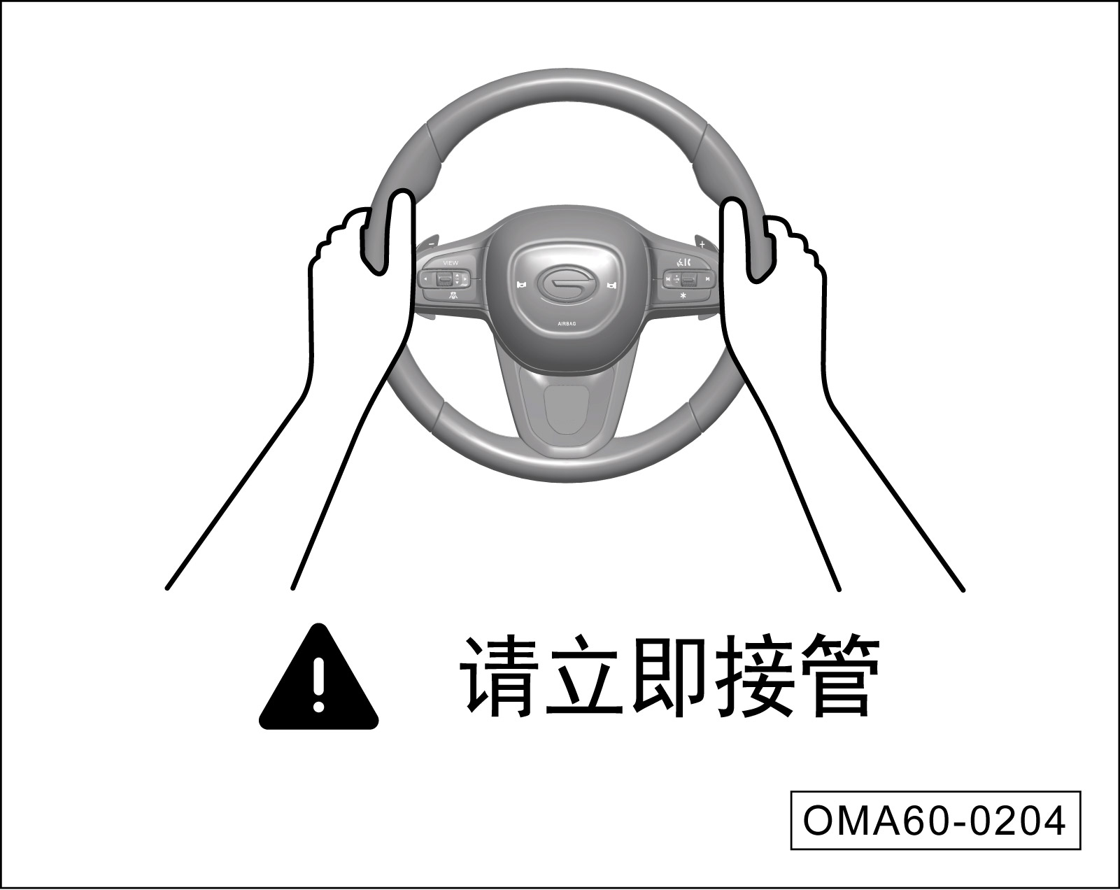 驾驶员接收到接管提示时,应立即手握方向盘。请勿惊慌,避免不必要地猛打方向盘。车道偏离系统监测到施加在方向盘上的手力矩时,即能识别到驾驶员手握方向盘,接管提示取消。车道偏离系统自动重新激活。