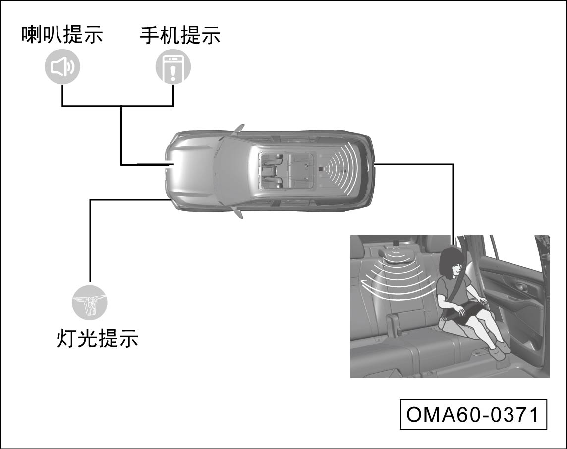 车辆熄火、车辆闭锁后10min内,生命体遗留辅助提醒功能通过安装在车内顶部的传感器检测车辆后排是否存在生命体征,若检测到生命体征,将通过喇叭、灯光提示、手机短信及APP推送报警提醒以提示驾驶员返回干预,保障乘员生命安全。