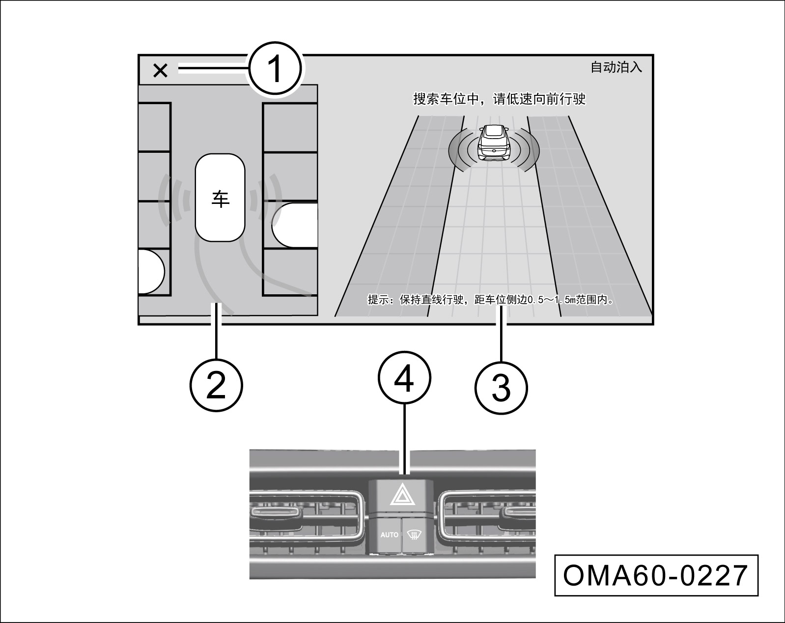 在车辆泊入车位的过程中,车辆会为您自动开启危险警告灯,增加泊车安全警示;在保证周边安全的前提下,可操作④按键进行关闭。