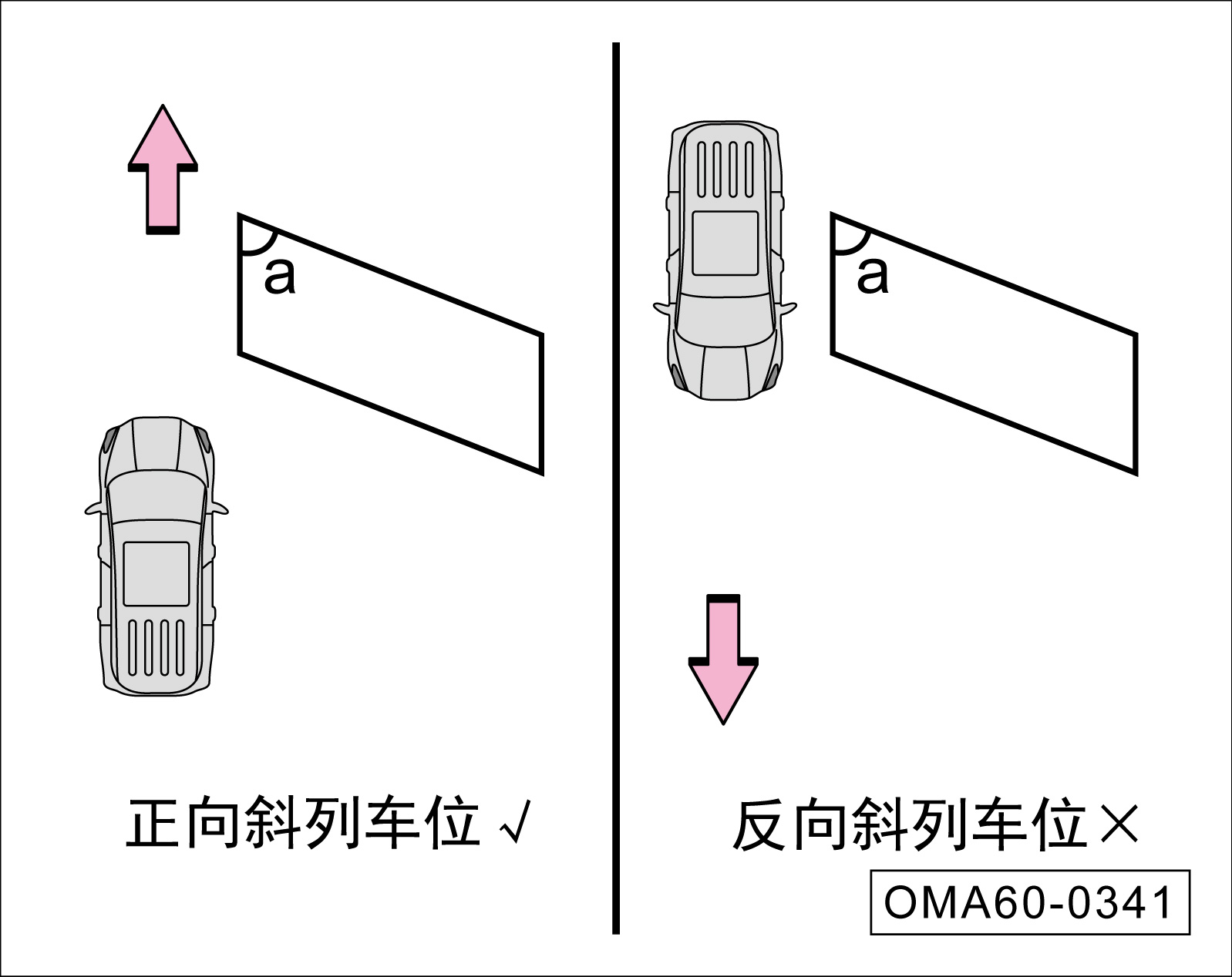 斜列车位泊车时,系统仅能通过正向搜索车位,反向无法搜索车位,正向角度a为45°/60°。