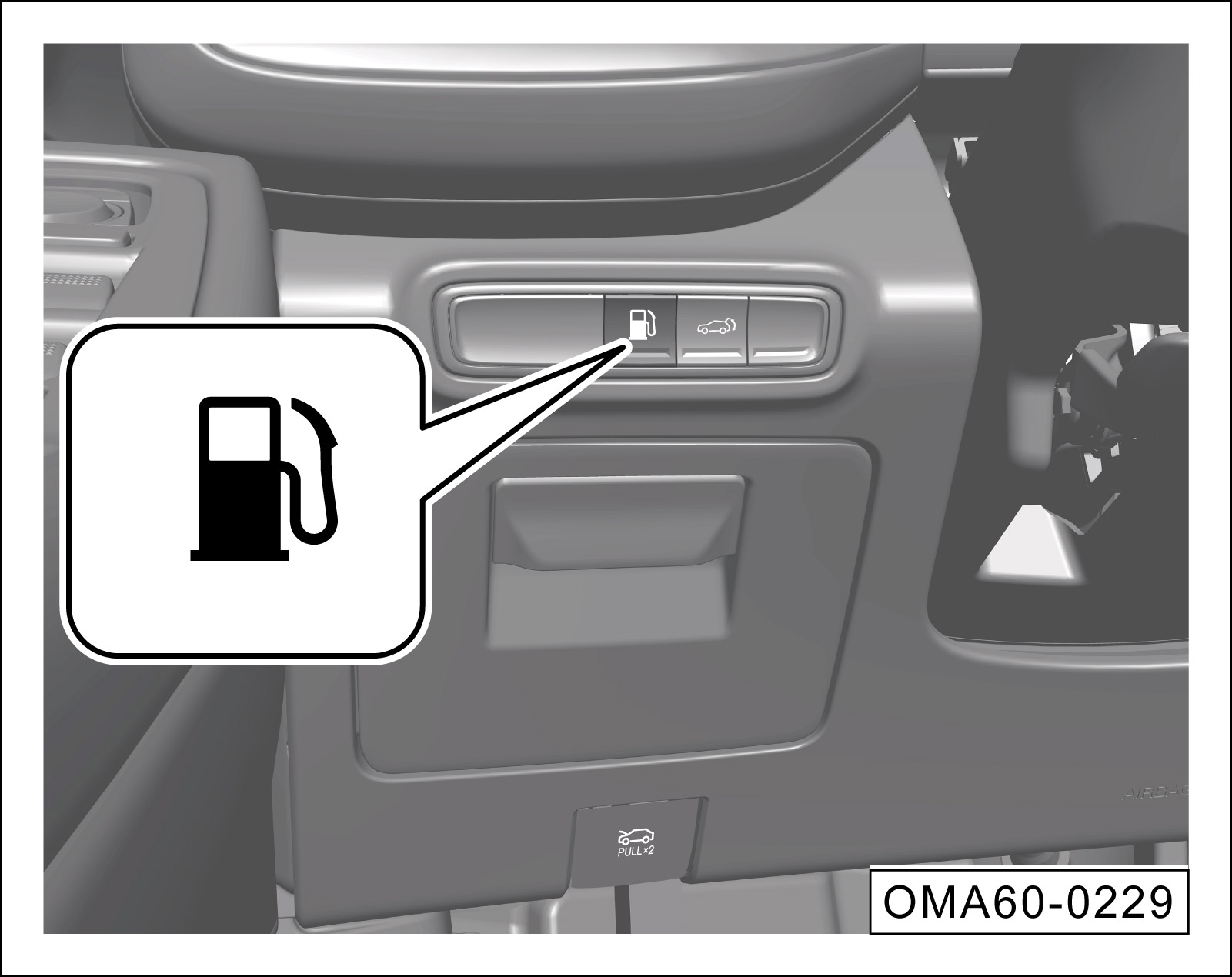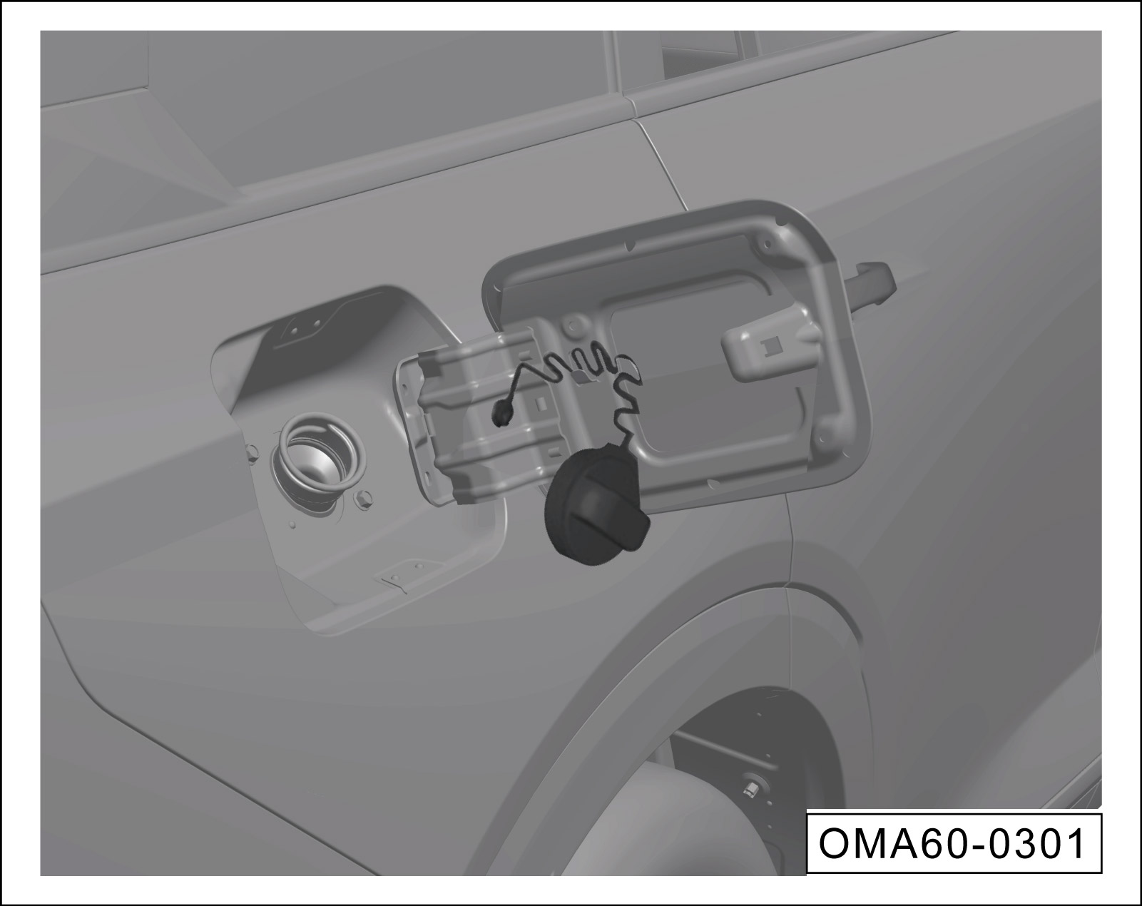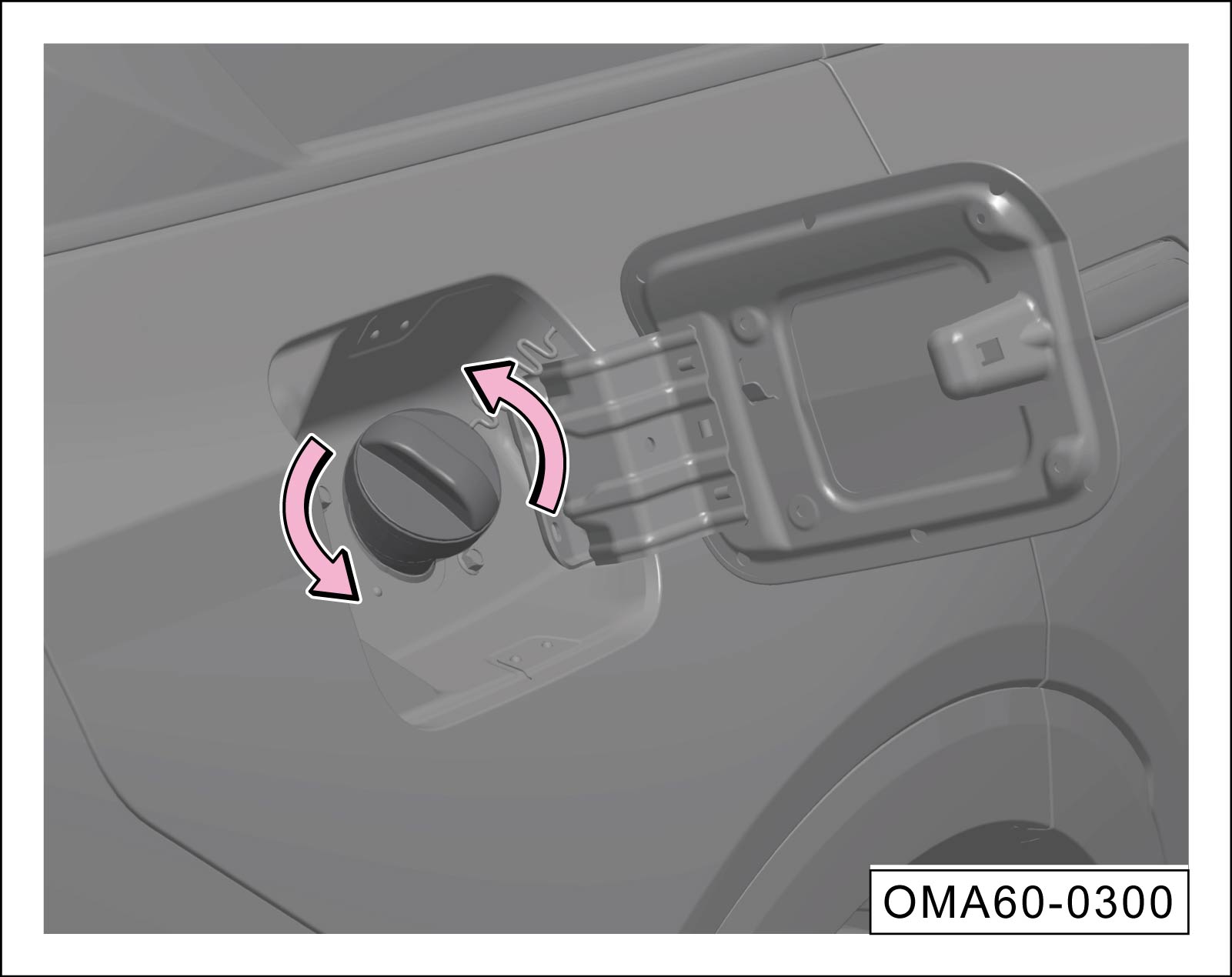 完全打开油箱盖板,沿-箭头-方向逆时针缓慢旋出加油口盖,完全拧出时将加油口盖停留在原位片刻,使燃油箱释放内部的燃油蒸汽压力,然后取出。