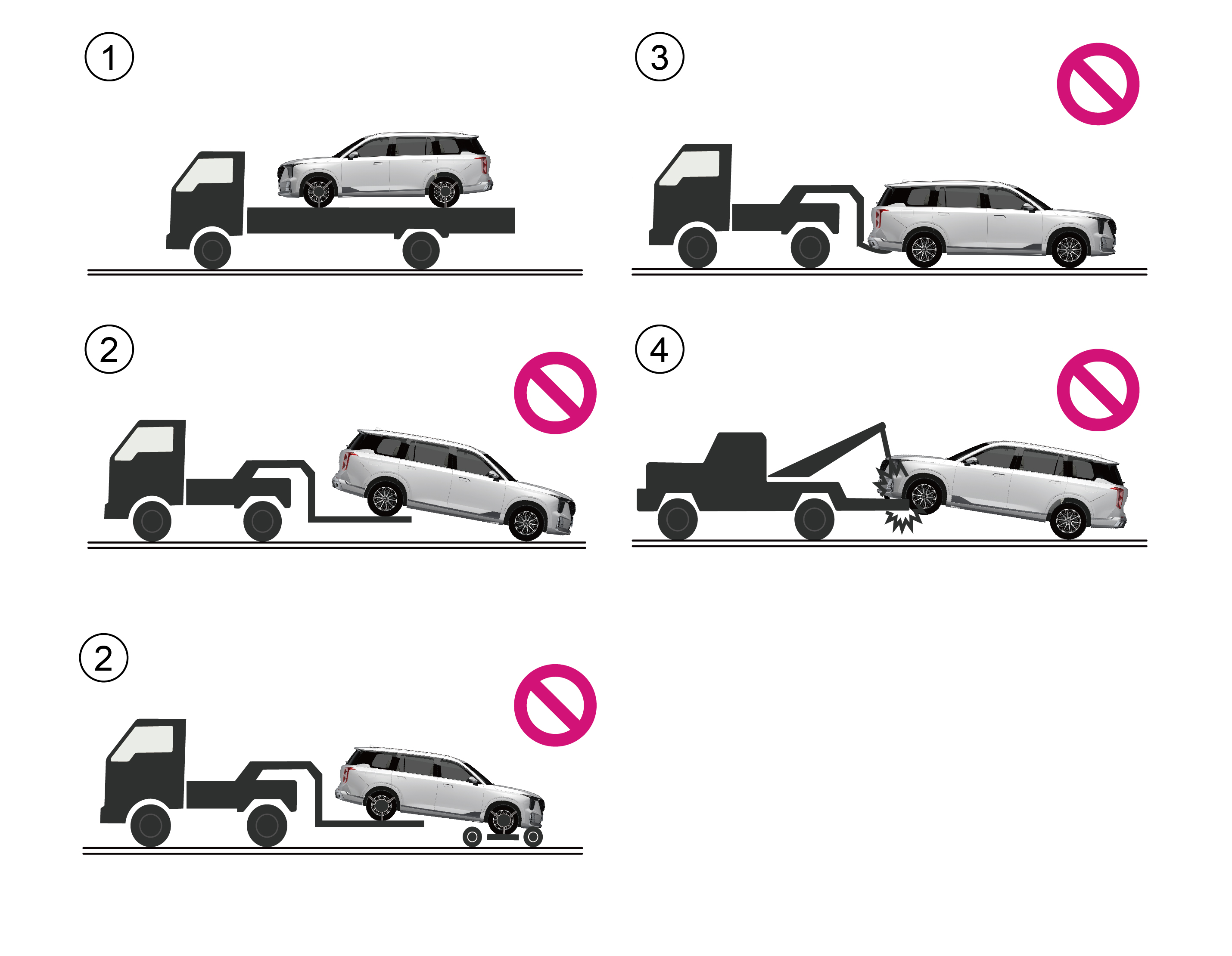 当车辆发生故障或事故导致车辆不能正常启动时,应采取图①平台式载货汽车的拖车方式撤离现场。
