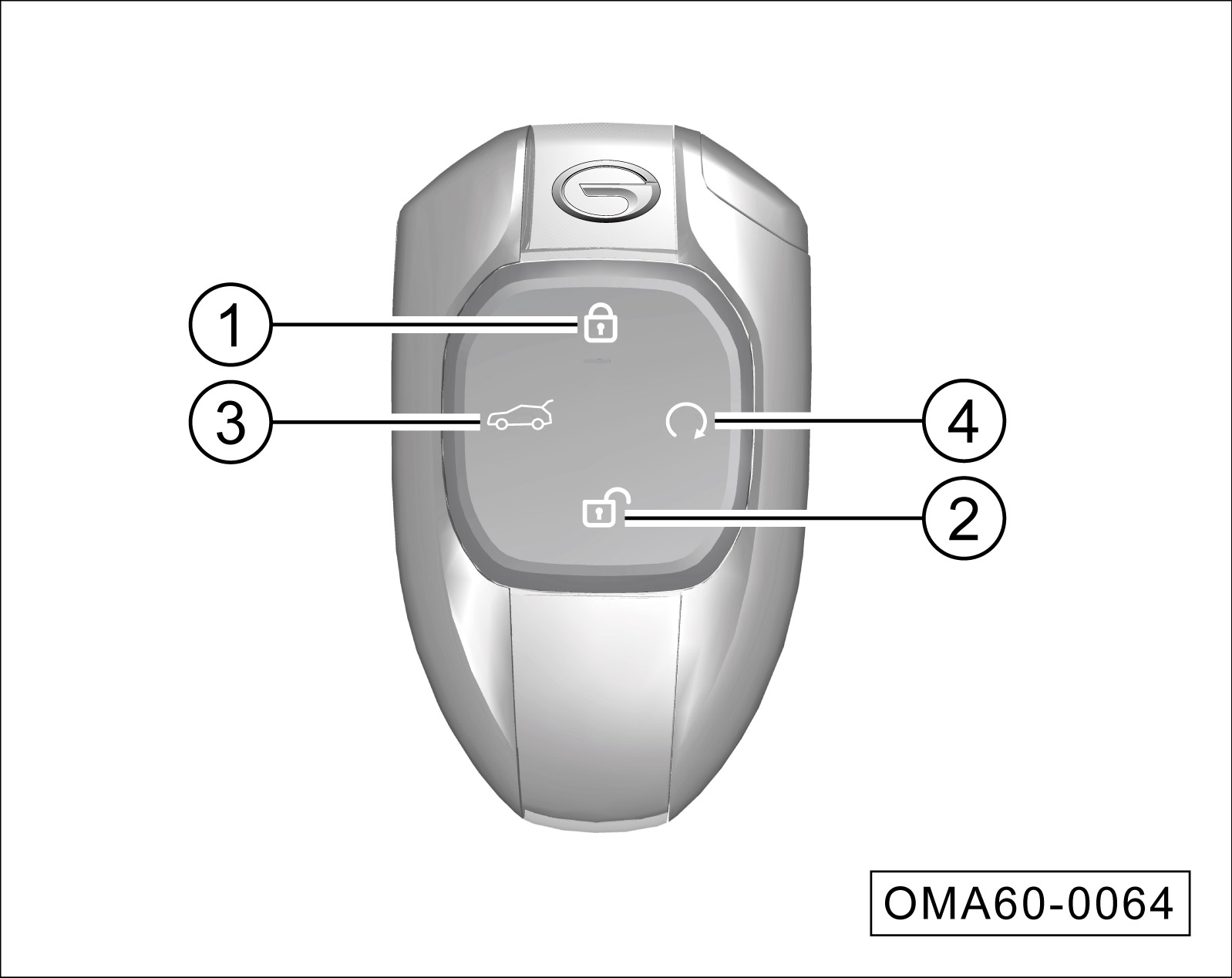 在有效范围内短按该按键1次,所有车门将闭锁。长按该按键,车窗、天窗*、遮阳帘*自动关闭;车窗、天窗*、遮阳帘*自动关闭过程中,若松开该按键,车窗、天窗*、遮阳帘*将停止关闭。