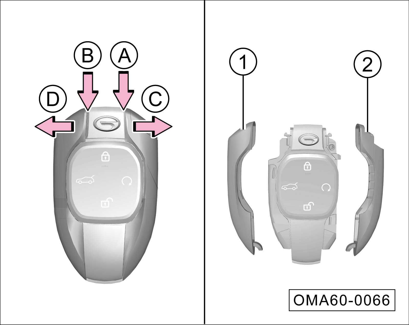 按压锁止按键①,同时沿-箭头-方向拉出应急机械钥匙②。