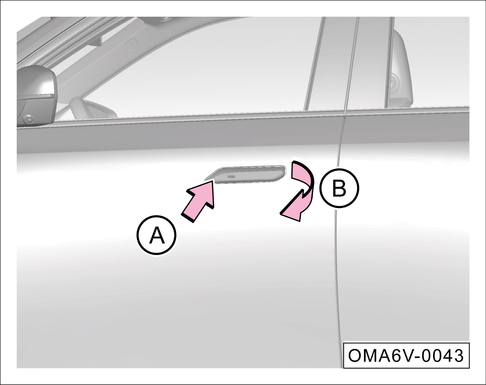 沿-箭头A-方向按压门把手左侧,使门把手右侧翘出,再沿-箭头B-方向将把手拉出一定角度。