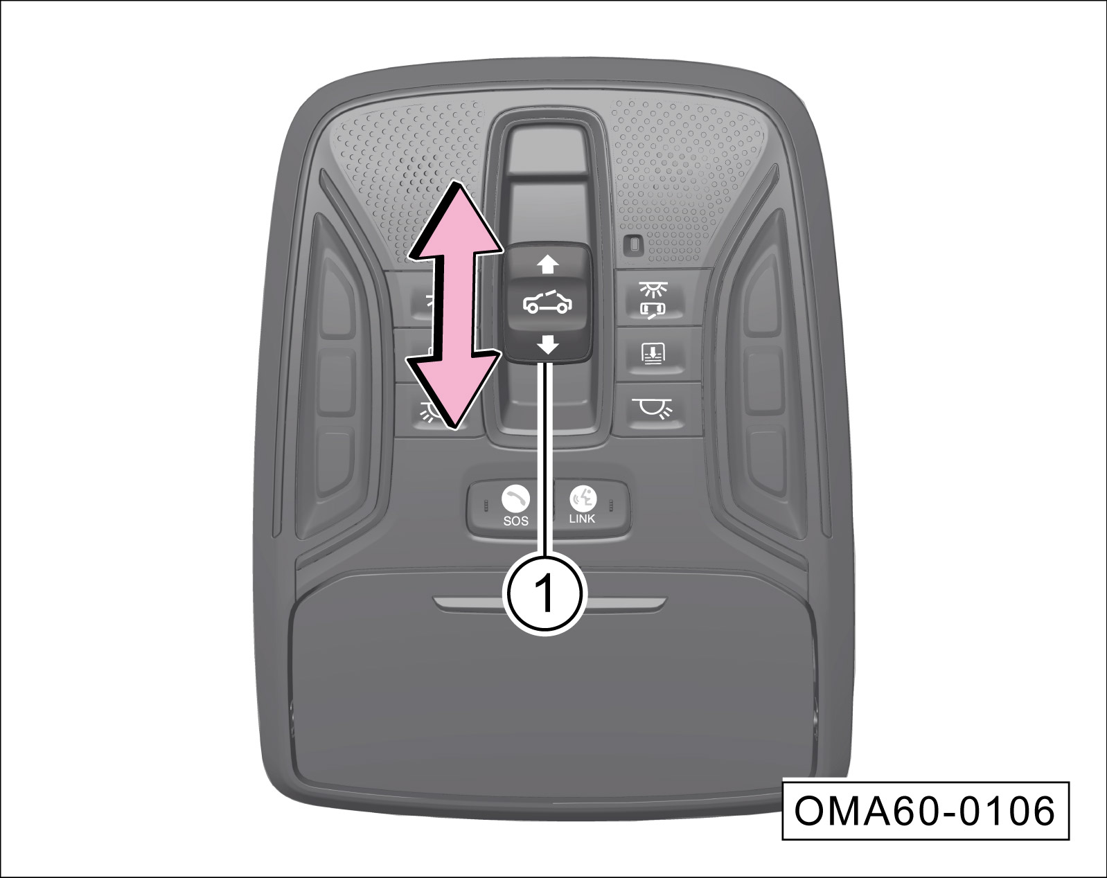 向后推动天窗开关①并保持一小段时间,天窗会打开到完全打开位置。