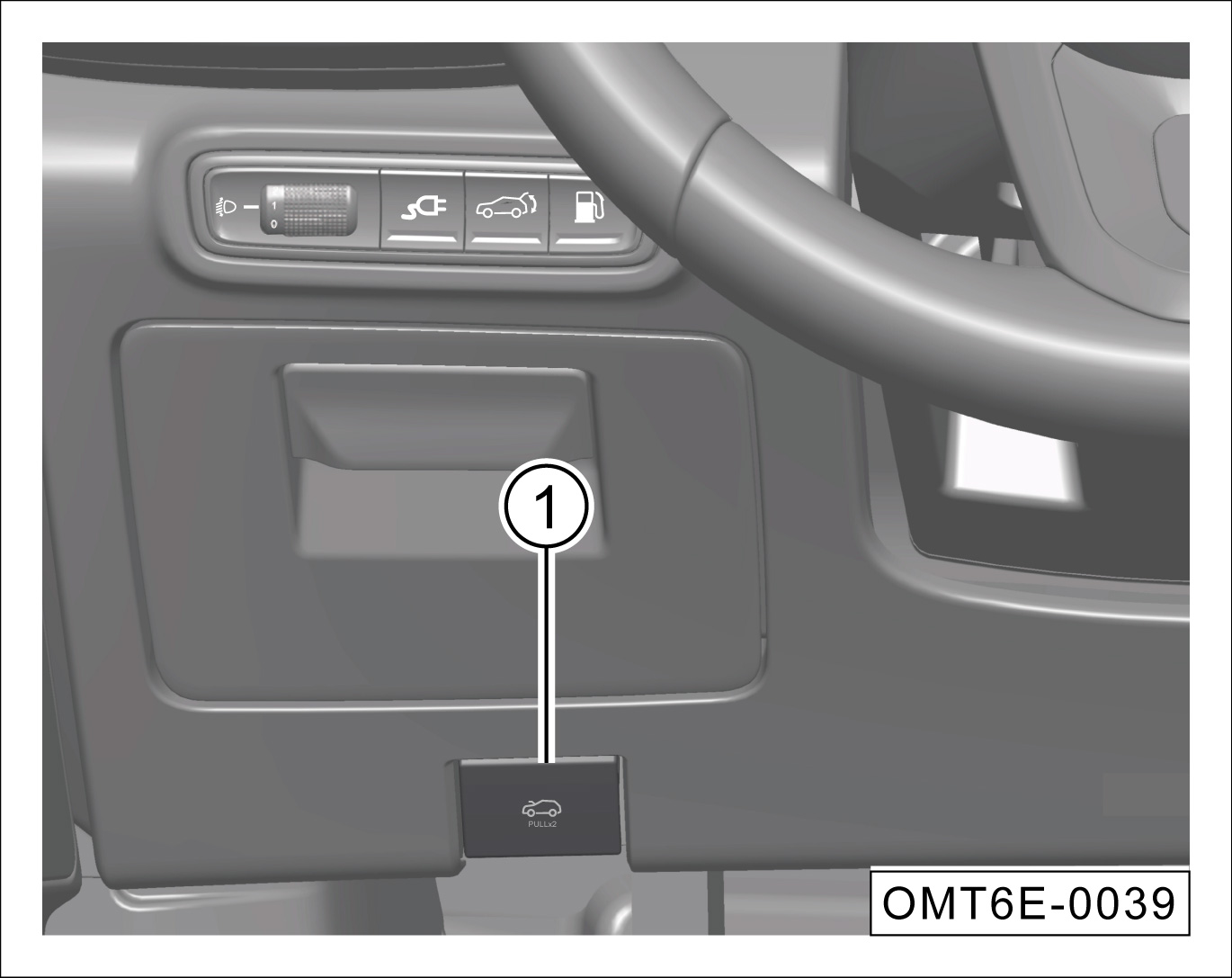 连续拉动驾驶员侧仪表板下方前机舱盖开启拉手①两次,前机舱盖解锁,此时可以打开前机舱盖。