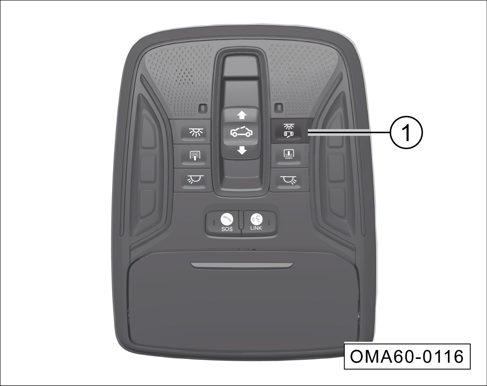 按开关①(开关凹下),关闭车顶照明灯自动开启功能;再次按开关①(开关弹起),打开车顶照明灯自动开启功能。